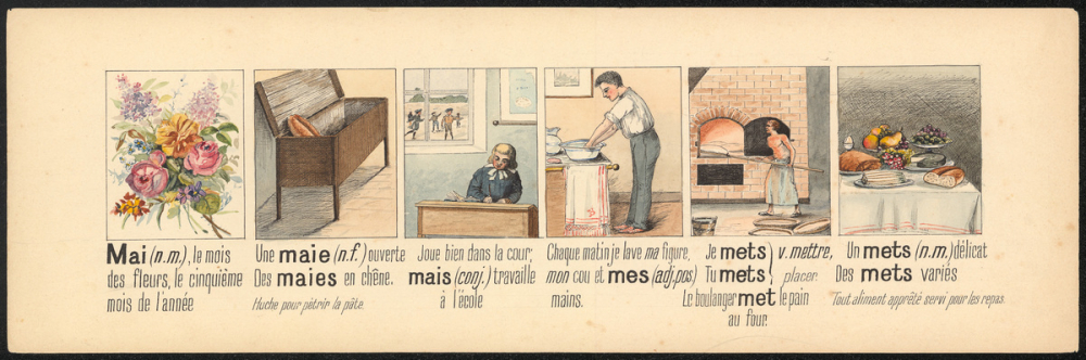 Représentations : mai, boulangère / Les vignettes illustrent dans l'ordre suivant : mai, le mois des fleurs ; une maie ouverte ; joue bien dans la cour mais travaille à l'école ; je me lave ma figure et mes mains ; je mets ; un mets délicat.