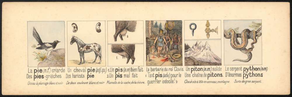 Planche illustrée pour apprendre l'homonymie : pie / pis, piton / python