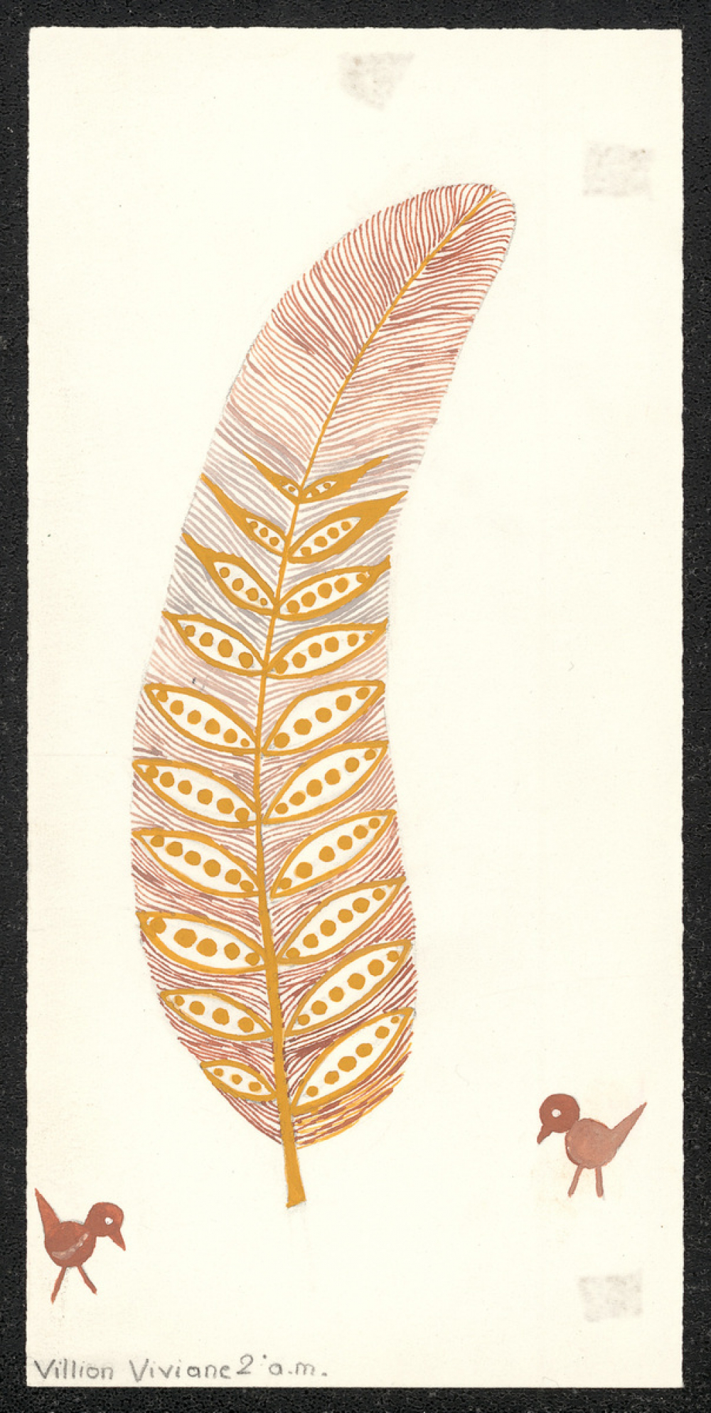 Représentations : plume / Plume composée de rayures grises et marrons symétriques mais aussi de motifs de couleur jaune semblant représenter des feuilles d'arbres contenant des ronds jaunes coloriés. Deux petits oiseaux marrons représentés de profil encadrent la plume.