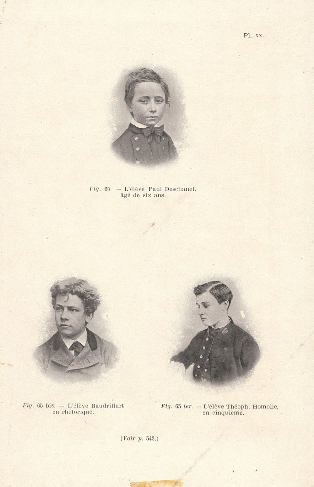Notes : 3 portraits : "Fig. 65 - L'élève Paul Deschanel, âgé de six ans."; "Fig. 65 bis - L'élève Baudrillart en rhétorique. "; "Fig. 65 ter - L'élève Théoph. Homolle, en cinquième."