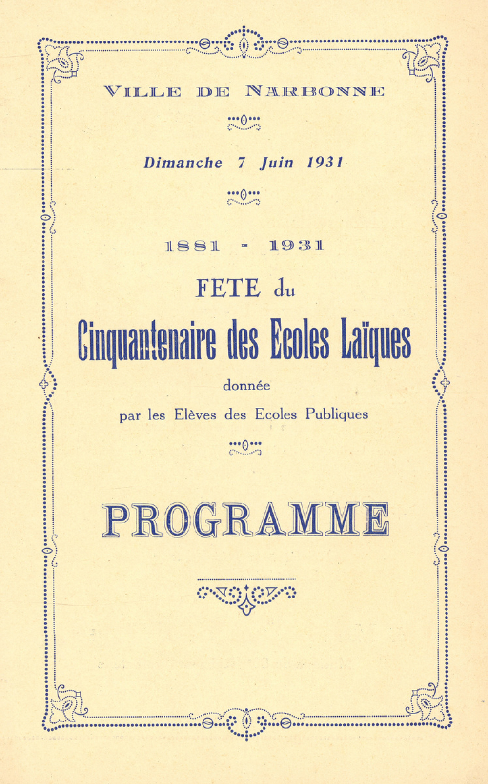 Programme de la fête du cinquantenaire des écoles laïques de la ville de Narbonne .