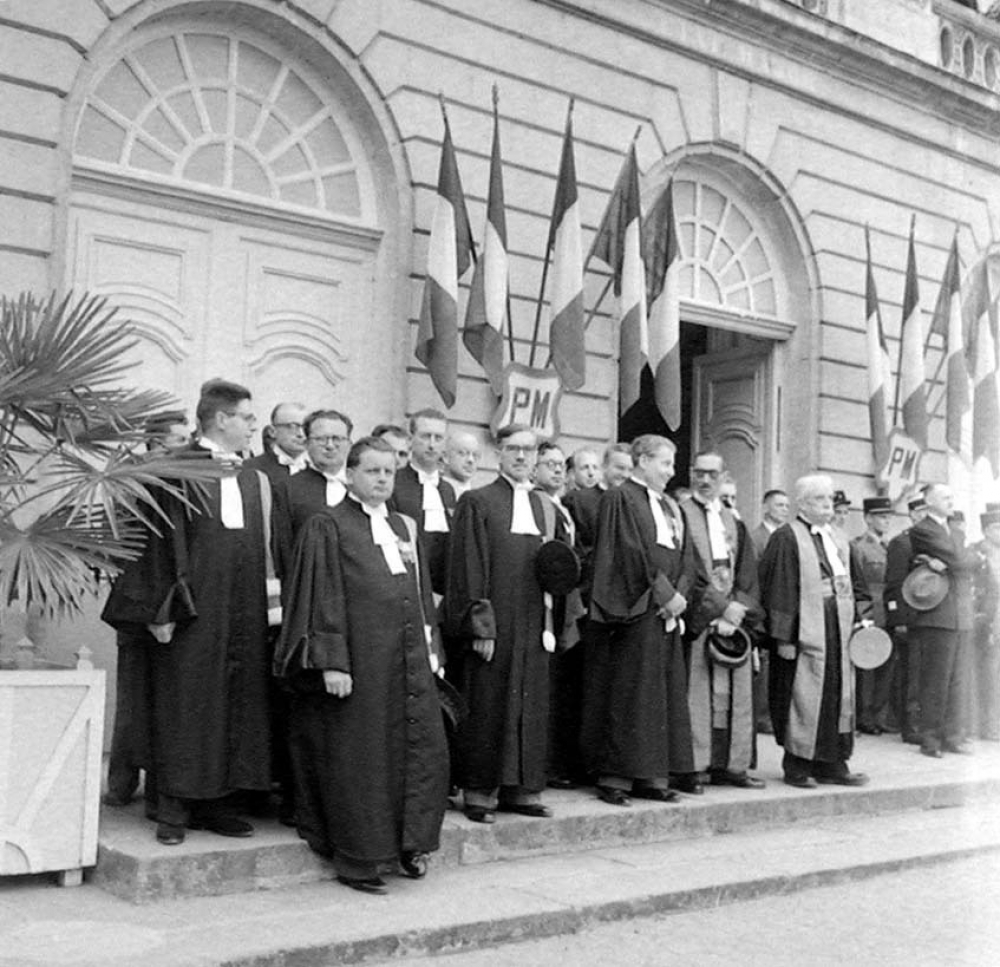 Représentations : scène : enseignant, commémoration / Le corps d'encadrement, en toge.