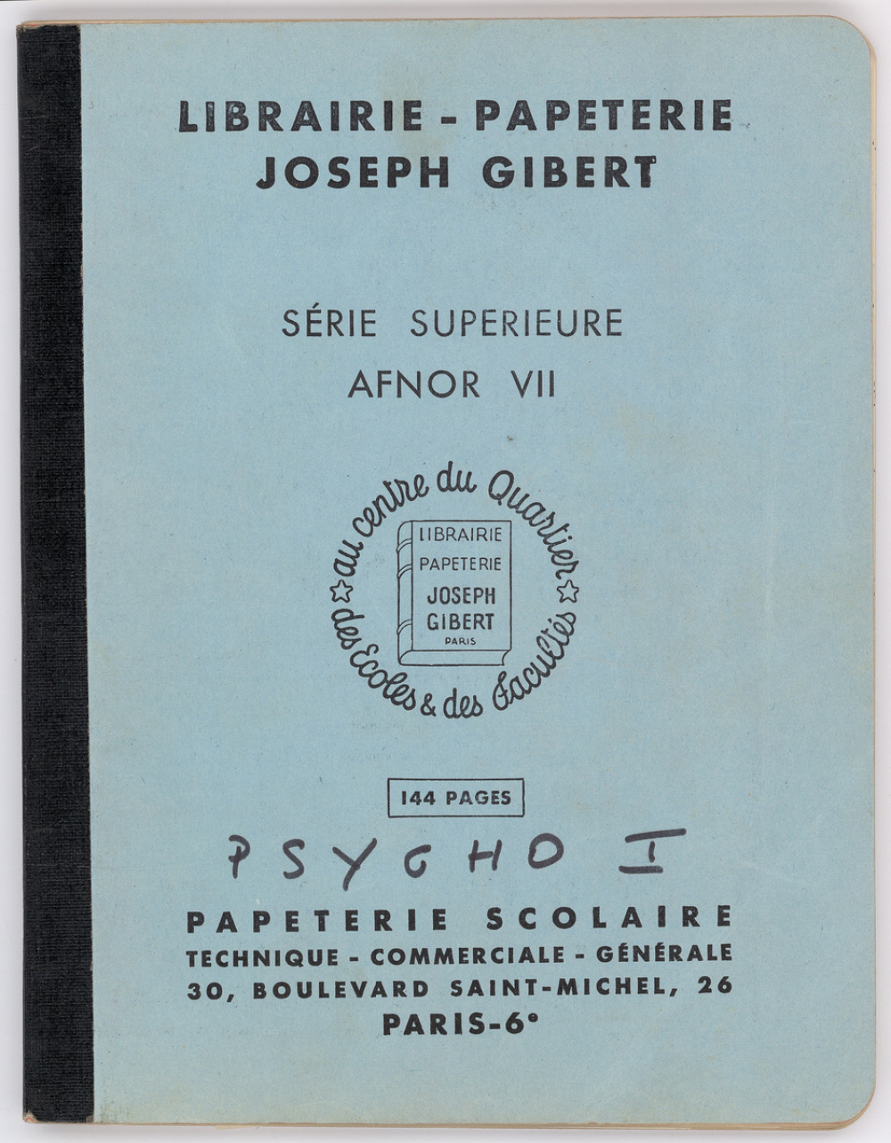 Description : Couverture en papier épais bleu clair à dos toilé synthétique noir. Reliure cousue. Réglure Séyès carreaux 8 x 8 mm avec marge rose.