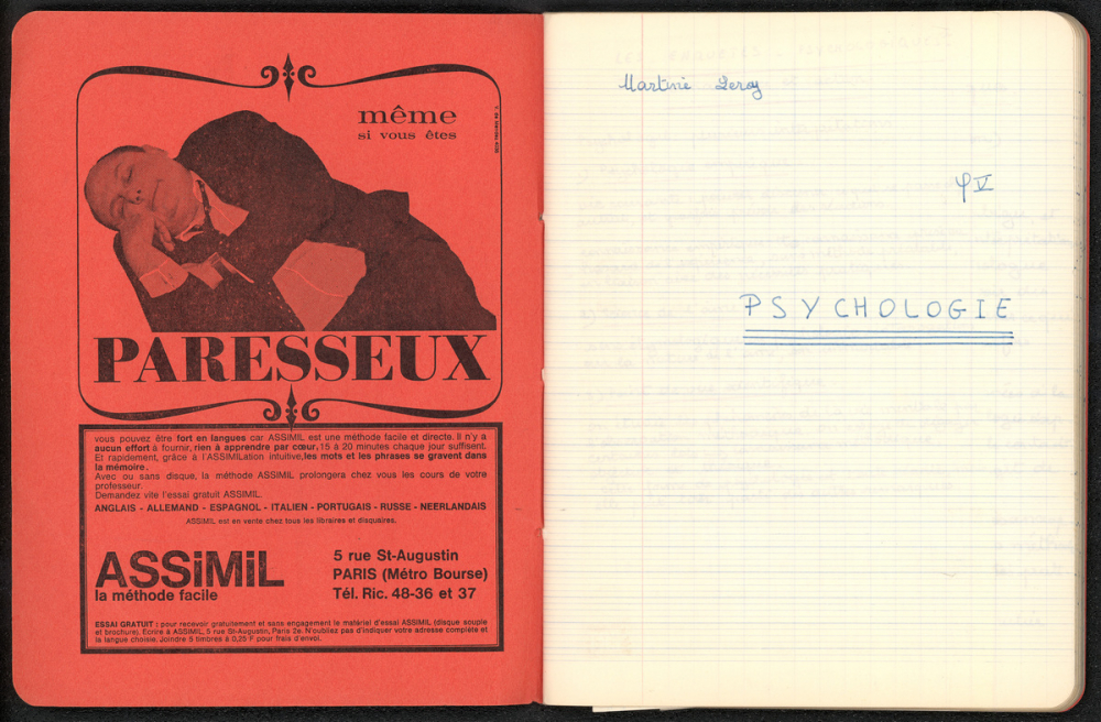 Notes : Cahier de Psychologie de Martine Leroy-Bouveyron (née Leroy) alors âgée de 19-20 ans, élève de classe préparatoire Fontenay, au lycée Claude Monet à Paris (XIIIe arrondissement), durant les années 1966 à 1968.