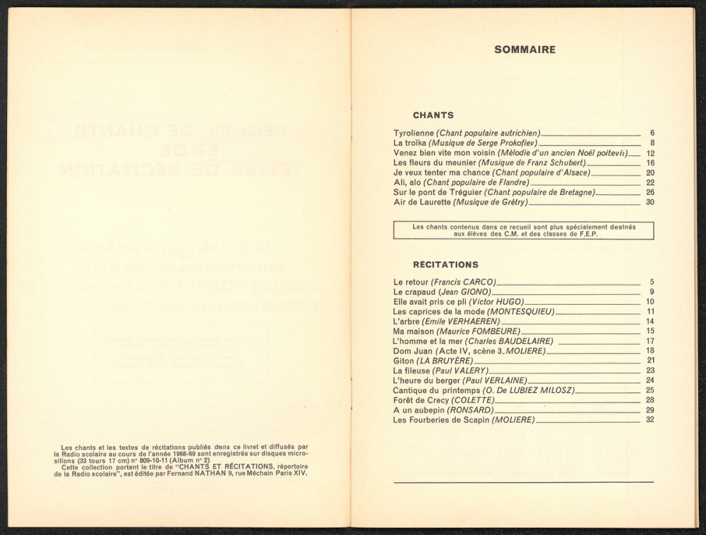 Utilisation / destination : enseignement (Le recueil accompagne les émissions diffusées par la Radio Scolaire en 1968-1969 : le mercredi pour le chant, le mardi pour la récitation. Les chants étaient destinés aux élèves des cours moyens (en particulier le CM2) et aux classes de FEP (Formation Élémentaire Professionnelle).)