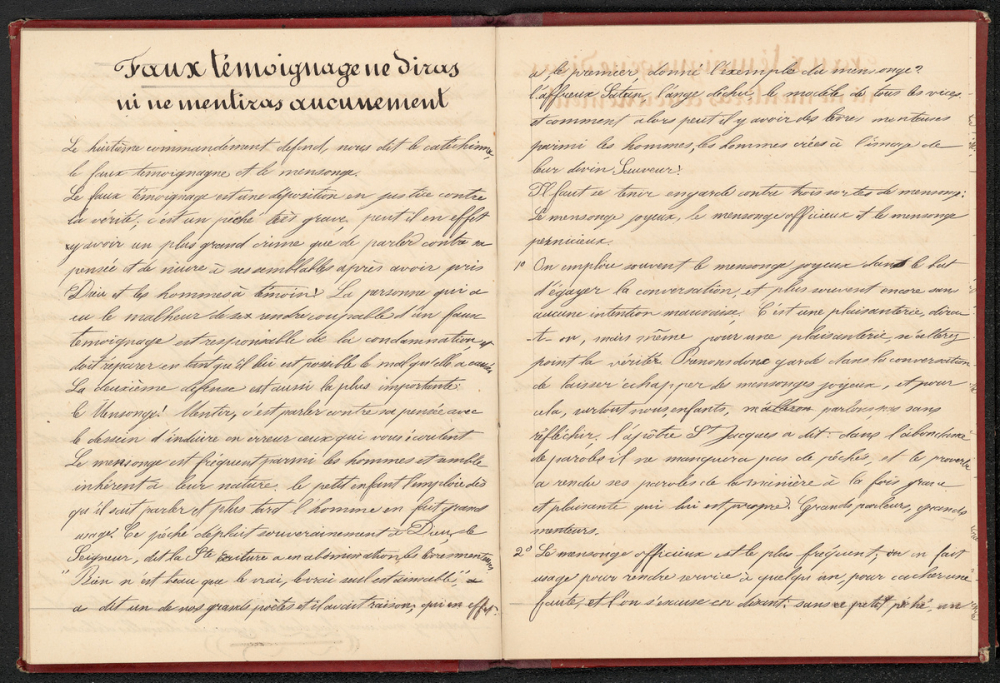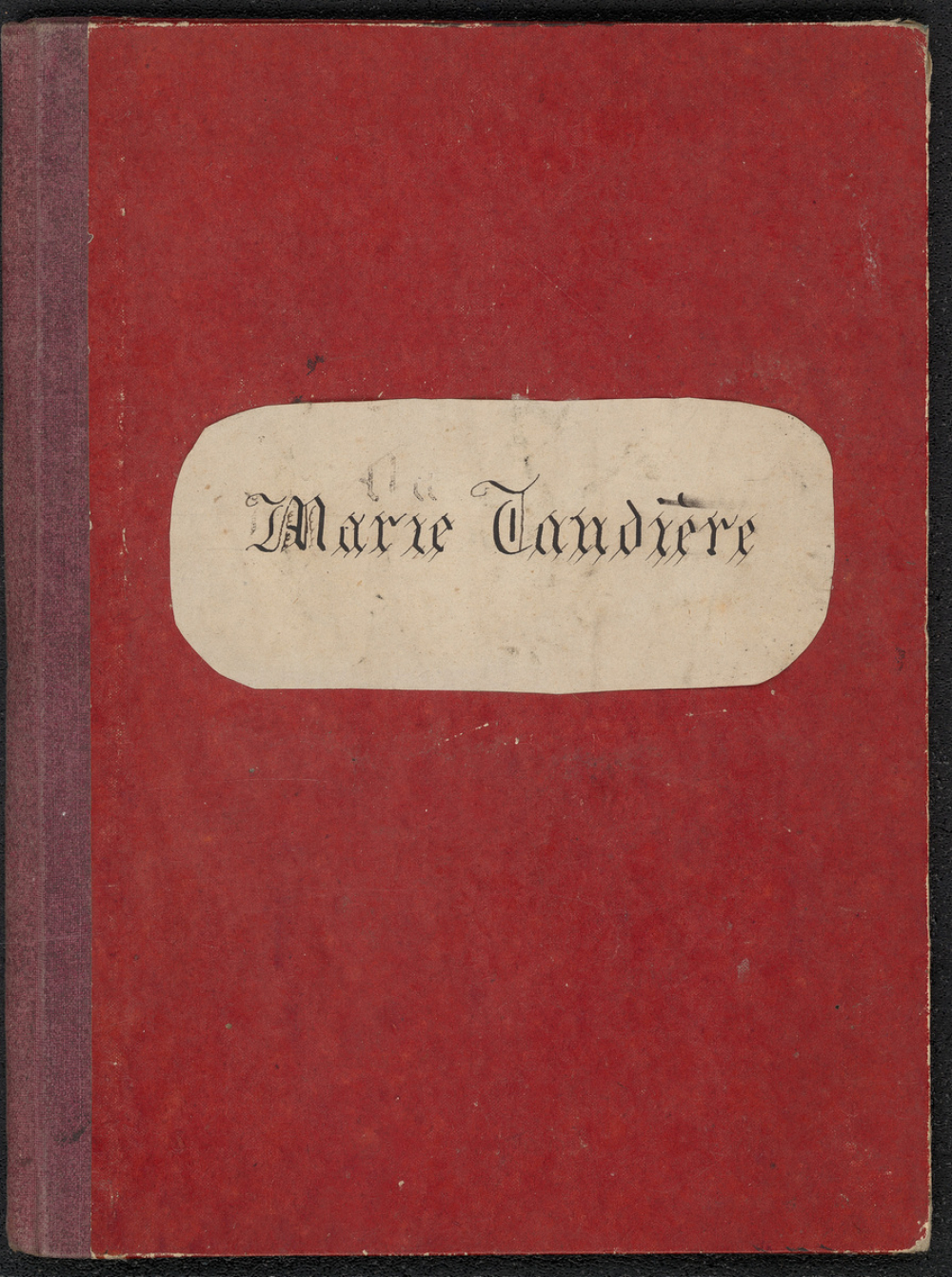 Notes : Il s'agit du cahier de rédaction d'indulgences de Marie Taudière probablement âgée d'une dizaine d'années et dont les travaux correspondraient à une institution d'enseignement religieux ou à un cours de catéchisme.
