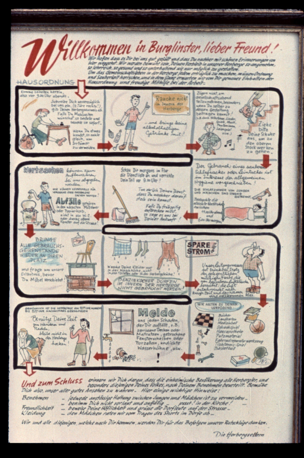 Représentations : représentation d'objet : auberge / Le visuel présente des règles de conduite de l'auberge, rédigées en allemand et illustrées sous forme de bande dessinée. L'affiche porte le titre : « Wilkommen in Burglinster, lieber Freund! »