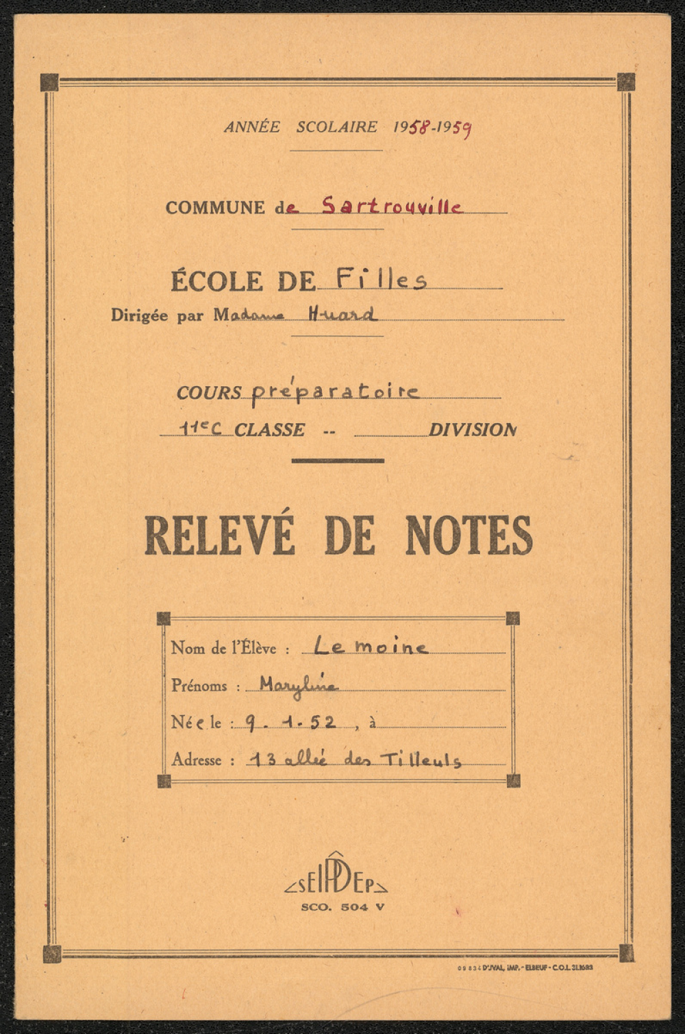 Notes : Il s'agit du relevé de notes de l'élève Maryline Lemoine, scolarisée en classe de 11e C du cours préparatoire à l'école des filles de Sartrouville (Jules Ferry) dirigée par Mme Huard, durant l'année scolaire 1958-1959.