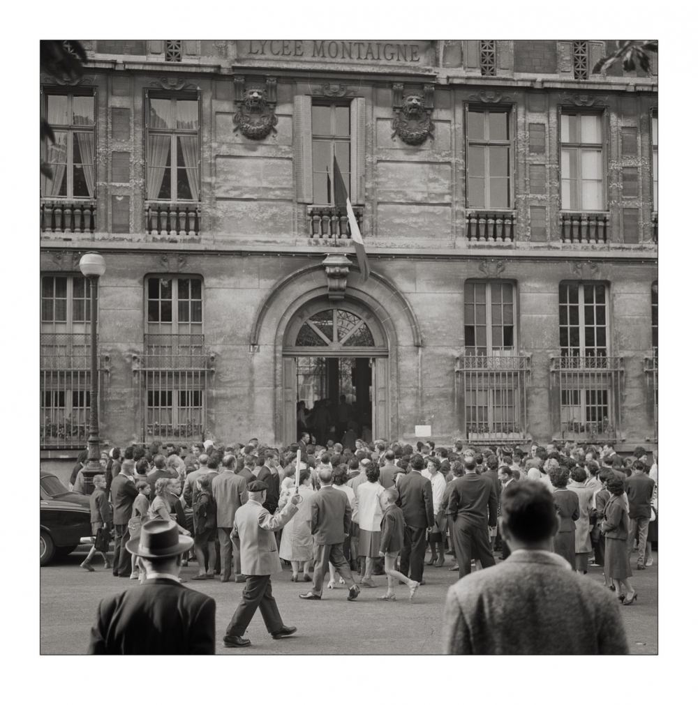 Représentations : scène : foule, homme, femme / Foule devant un bâtiment sur la façade duquel on peut lire, gravée dans la pierre, l'inscription : "LYCEE MONTAIGNE".