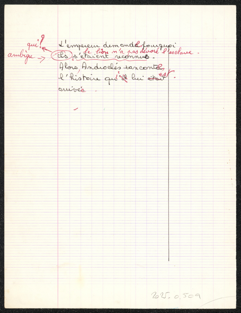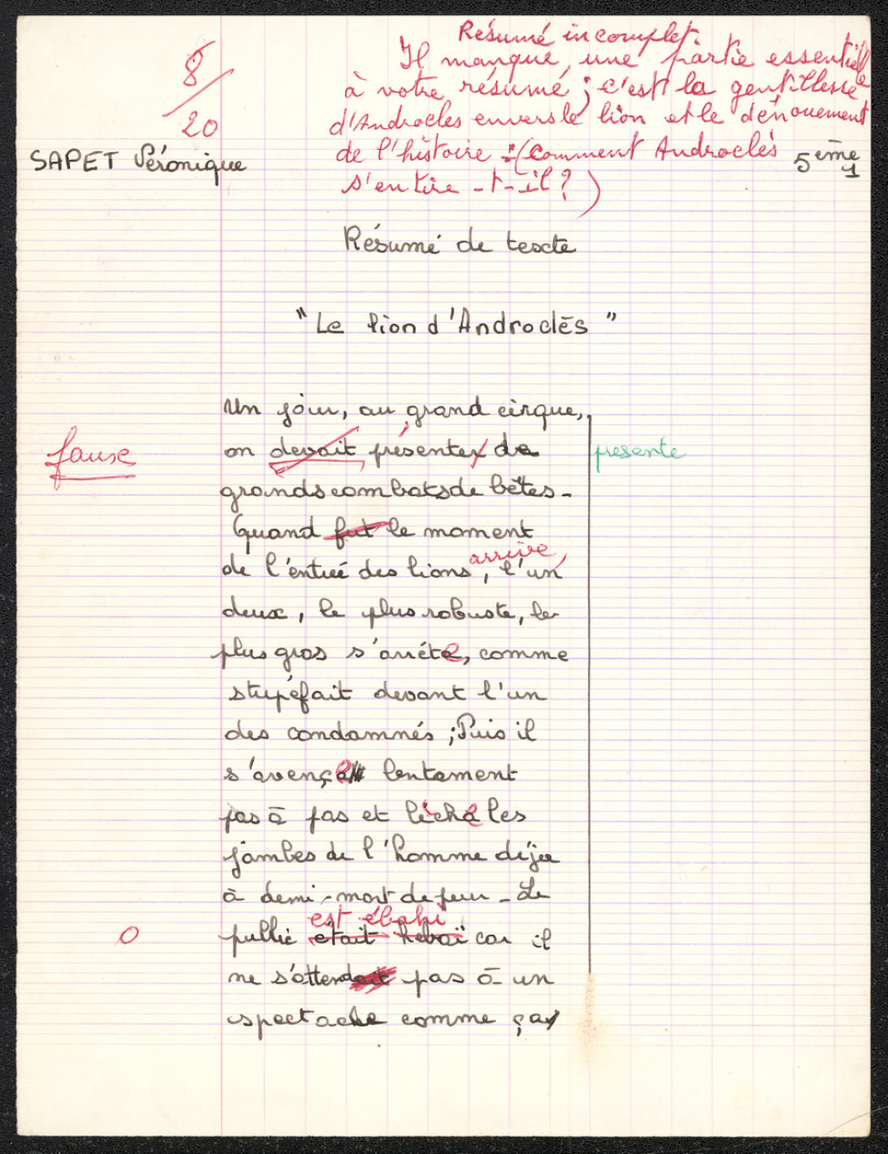 Notes : Il s'agit d'une copie d'évaluation de Français de l'élève Véronique Sapet, alors scolarisée en 5e 1 au Collège La Fayette du Puy-en-Velay, durant l'année 1978-1979.