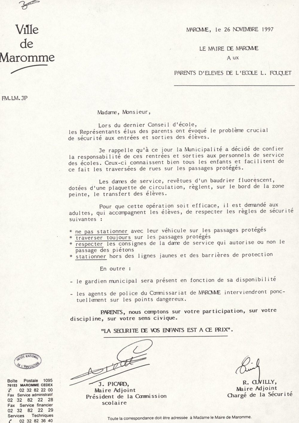 Sécurité aux entrées et sorties des élèves de l'école L. Fouquet à Maromme.