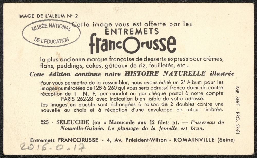 Description : Impression couleur (recto) et texte imprimé (verso) sur papier