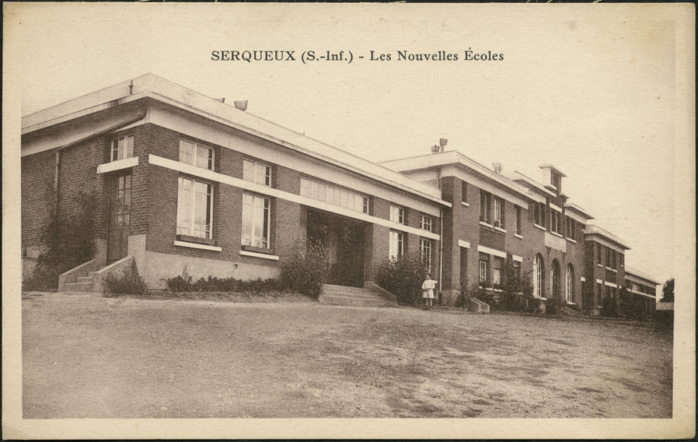 Notes : Photographie représentant un long bâtiment en briques en plusieurs parties abritant les nouvelles écoles.