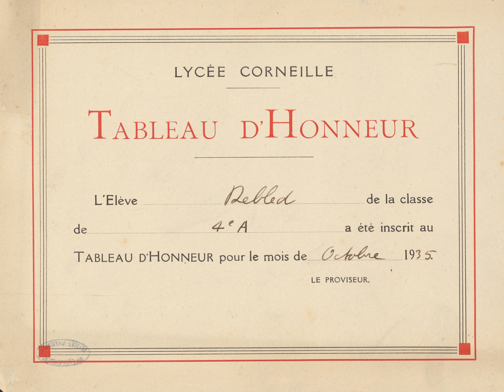 Sept tableaux d'honneur pour les mois de décembre 1935, janvier, février, mars, mai et juin 1936. Ils portent l'en-tête du lycée Corneille, la mention de l'élève et de son niveau, et ponctuellement, la signature du proviseur.