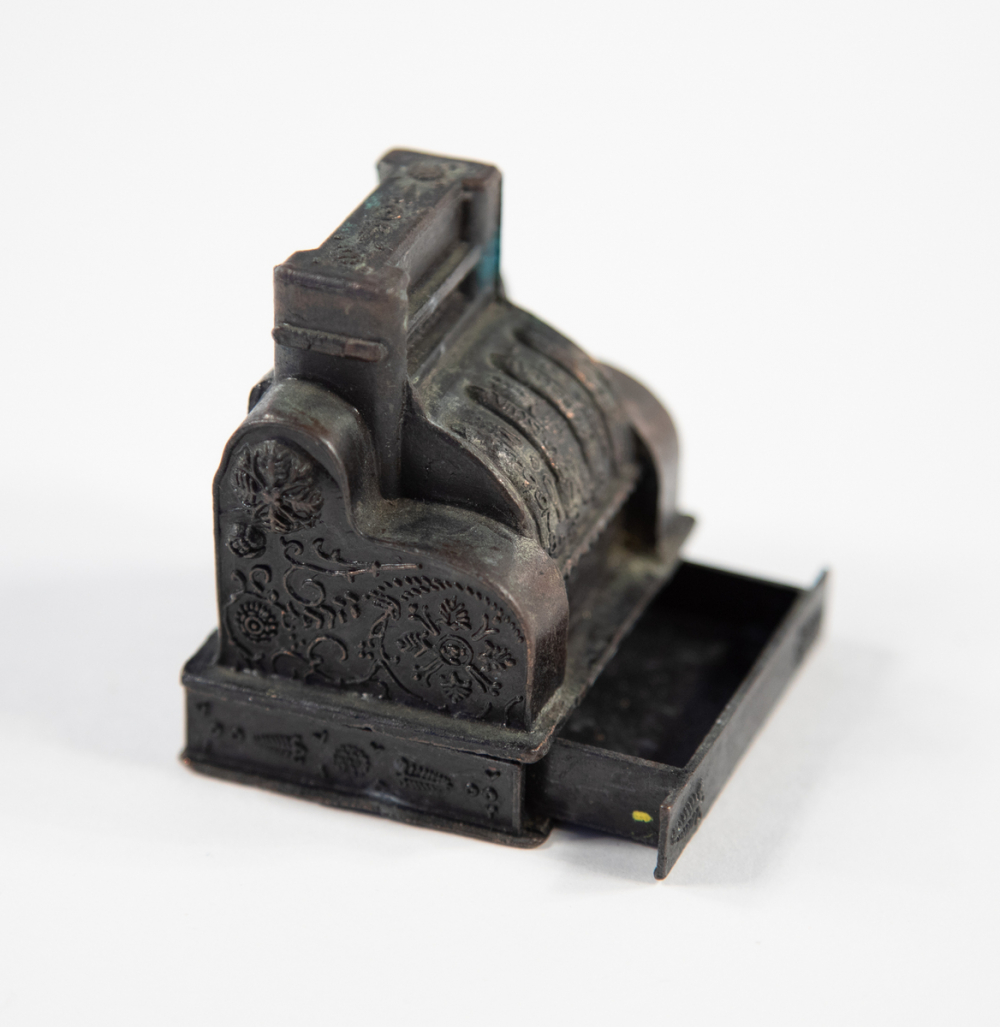 Description : Taille-crayon miniature en métal moulé figurant une caisse enregistreuse ancienne. Corps rectangulaire compact sur socle simple, avec façade ornée d’une rangée de rouleaux simulant les chiffres d’affichage. Bouton latéral stylisé. Le logement du taille-crayon est intégré à la base amovible. Lame non visible.