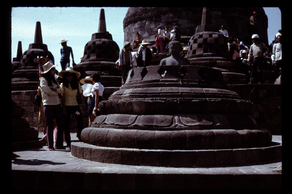 Temple de Borobudur à Java : voyageurs autour d'une statue de Bouddah