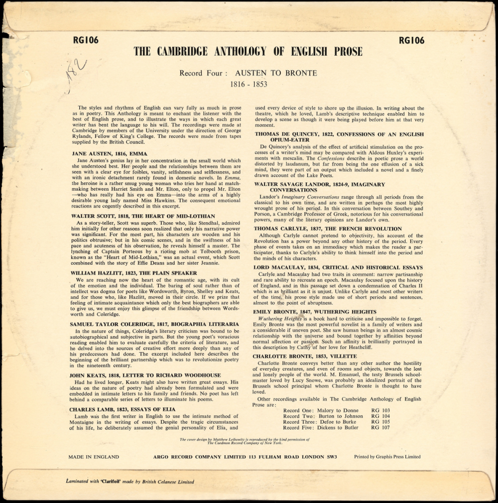 - Side 2 : Confessions of an english opium-eater / Thomas de Quincey (1822) ; Imaginary conversations / Walter Savage Landor (1824-9) ; The French Revolution / Thomas Carlyle (1837) ; Critical and historical essays / Lord Macaulay (1834) ; Wuthering Heights / Emily Brontë (1847) ; Villette / Charlotte Brontë (1853).