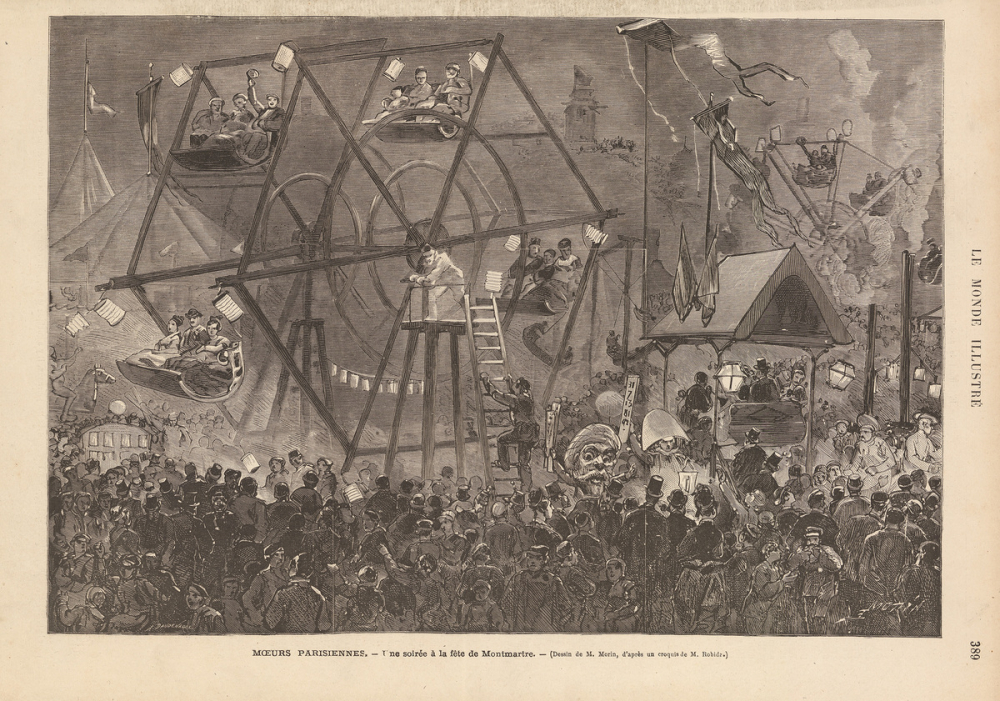 au-dessous du tr. c. : "Moeurs parisiennes. - Une soirée à la fête de Montmartre. - (Dessin de M. Morin, d'après un croquis de M. Robida.)".
