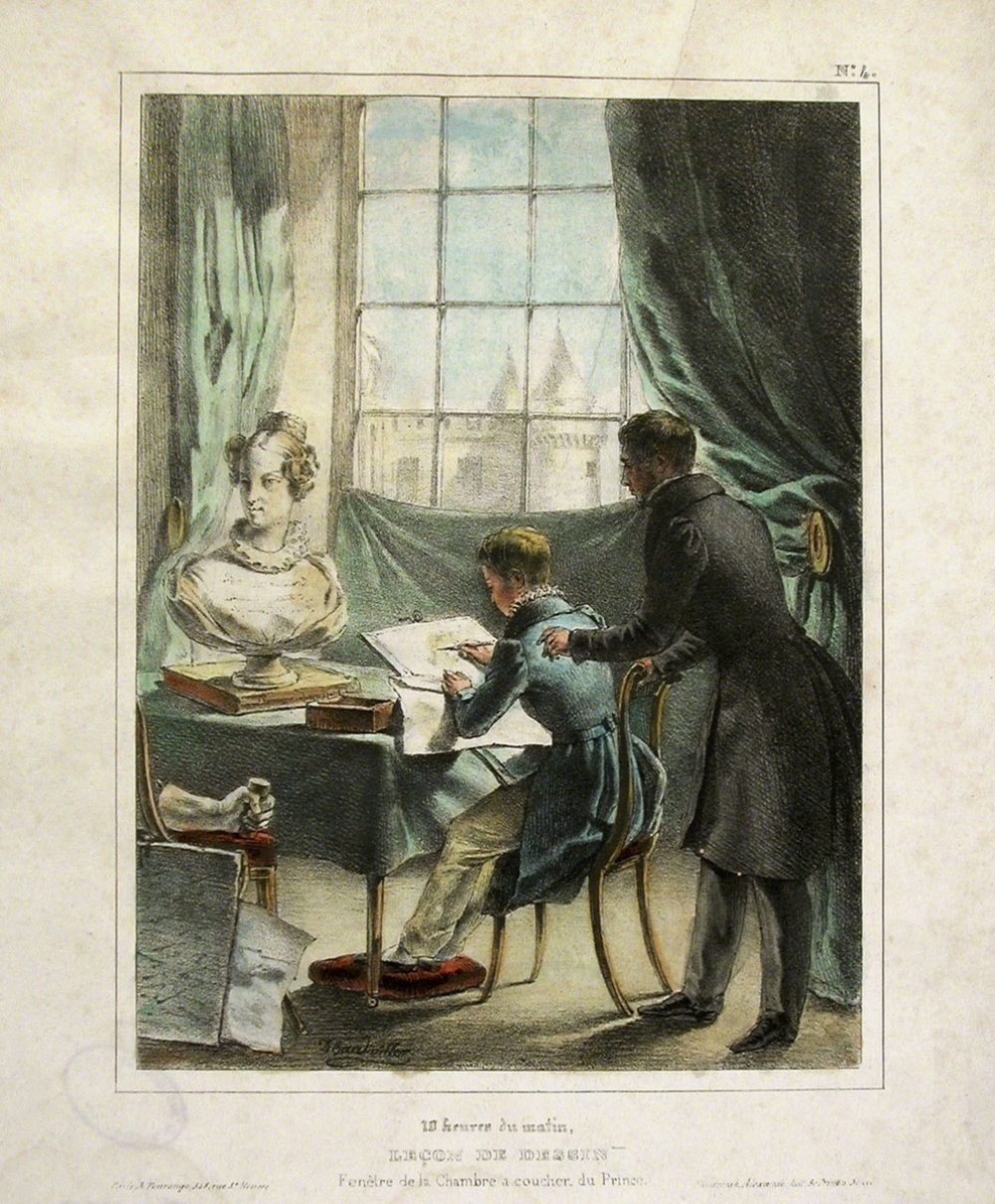 - Une des douze planches consacrées à "Une journée du jeune exilé, recueil de dessins représentant les diverses études ou exercices du duc de Bordeaux" par son professeur de dessin.