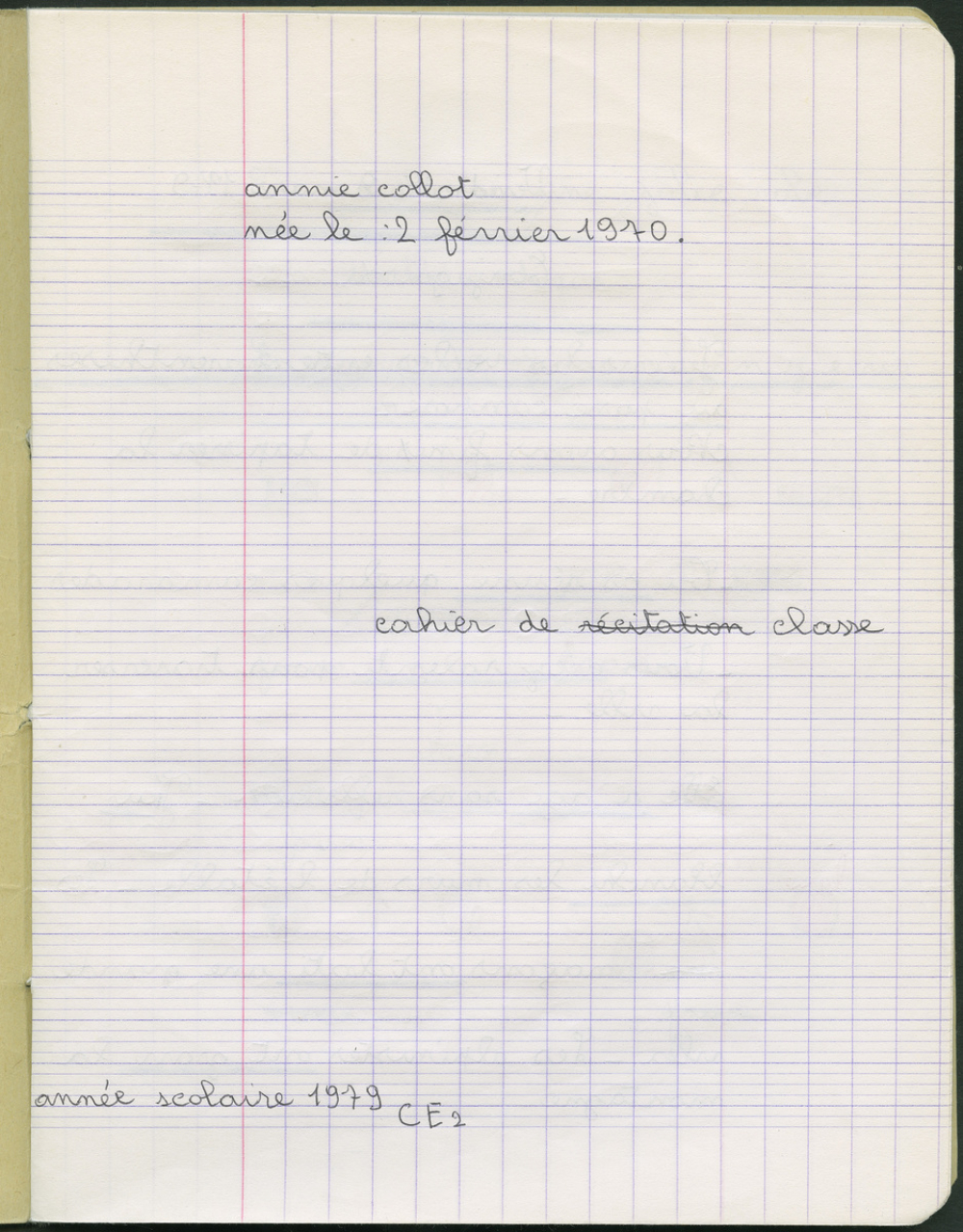 Description : Cahier cousu "Avia". Couv. de couleur jaune portant, en son dos, un liseret noir et, en Première p. de couv., le logotype de cette marque (i.e : une silhouette d'oiseau), ainsi que les mentions "Cahier ... Ecole ... Classe .. Nom ...". Réglure Seyès. Ecriture à l'encre noire, corrections à l'encre verte. Nombreux soulignements au crayon de couleur bleue puis violette et bleue claire. Visas, corrections, appréciations et notes de l'enseignant à l'encre rouge. Quelques figures de géométrie, réalisées au crayon à papier.