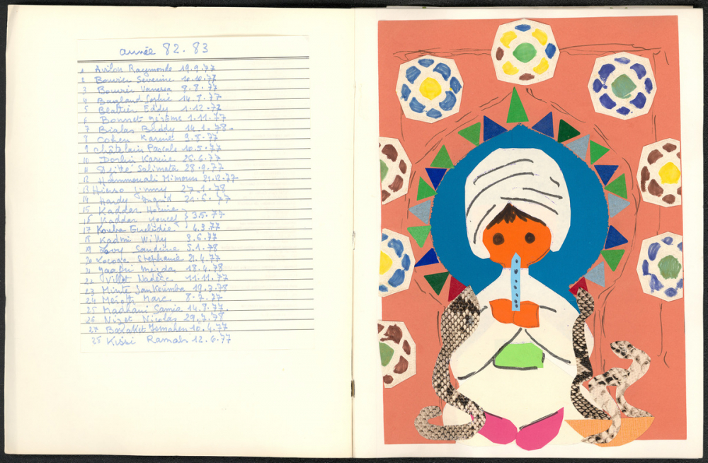 Collage, sur une double page, représentant au premier plan trois dromadaires, deux personnages voilés (un homme et une femme) devant quatre palmiers, et à l'arrière-plan une ville aux murailles ocre intitulé "Mar(r)akech" - anonyme