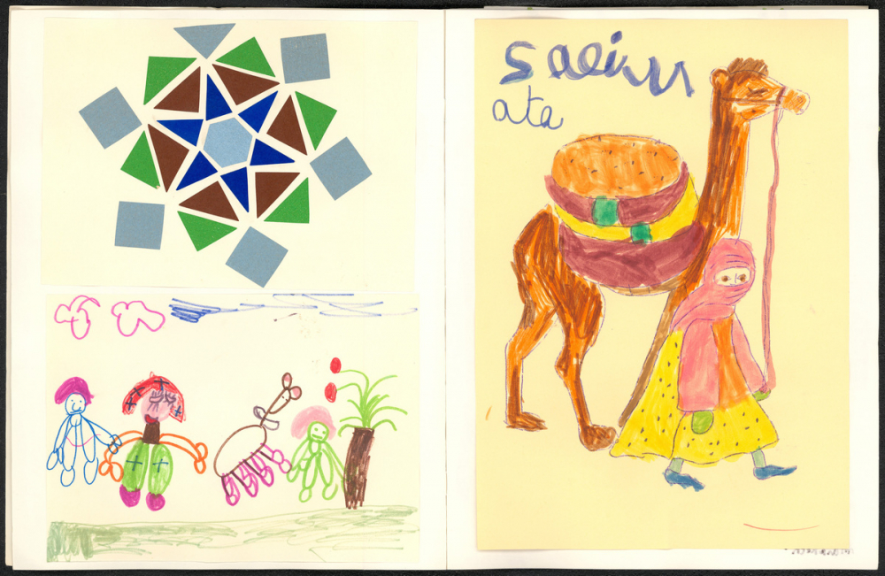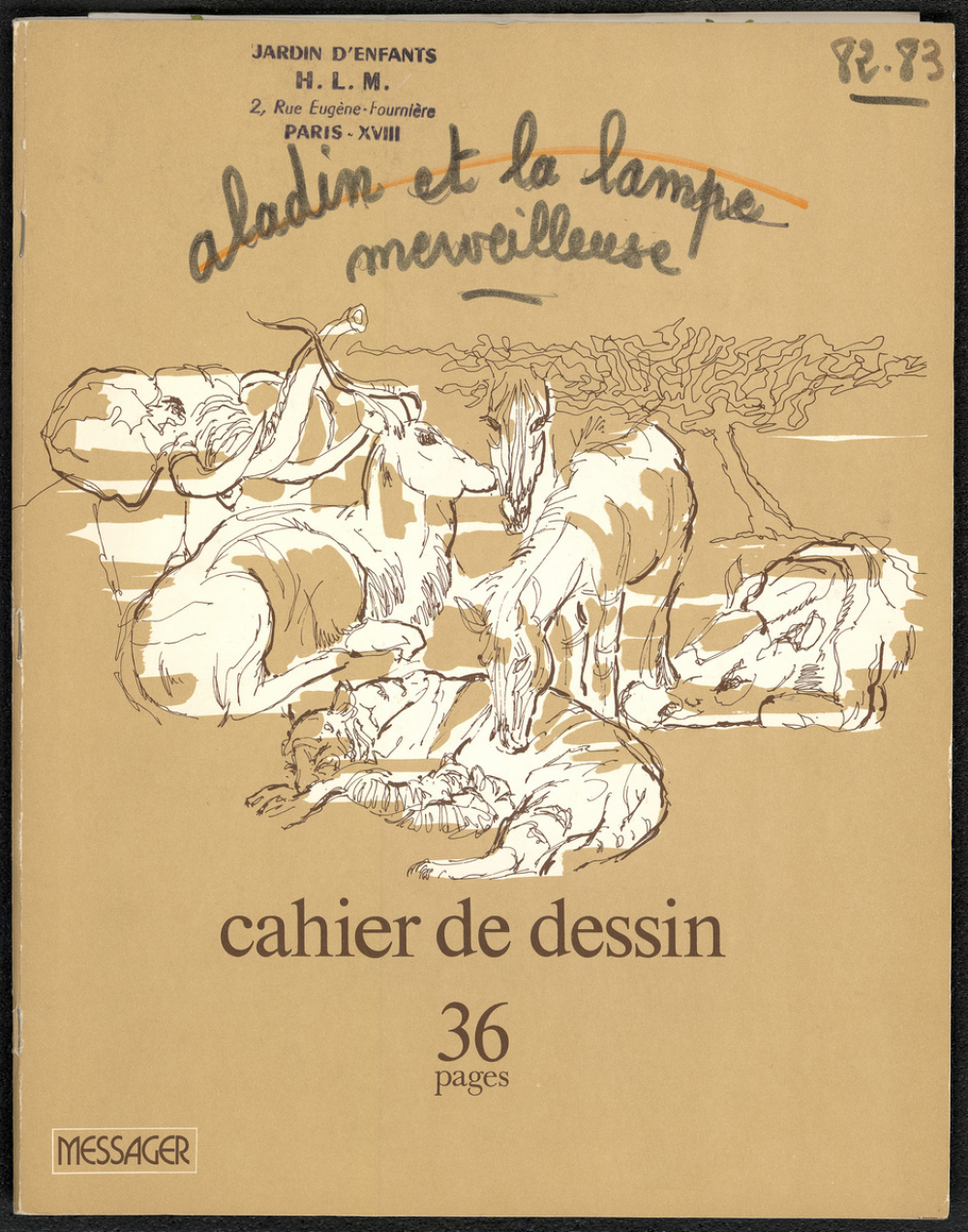 Notes : Il s'agit d'un cahier de dessin du Jardin d'enfants H.L.M., situé au 02, rue Fournière (désormais au n° 20) à Paris dans le XVIIIe arrondissement, dépendant donc de l'accompagnement municipal des OPHLM de l'EJE (éducateur de jeunes enfants) de La Ville de Paris.