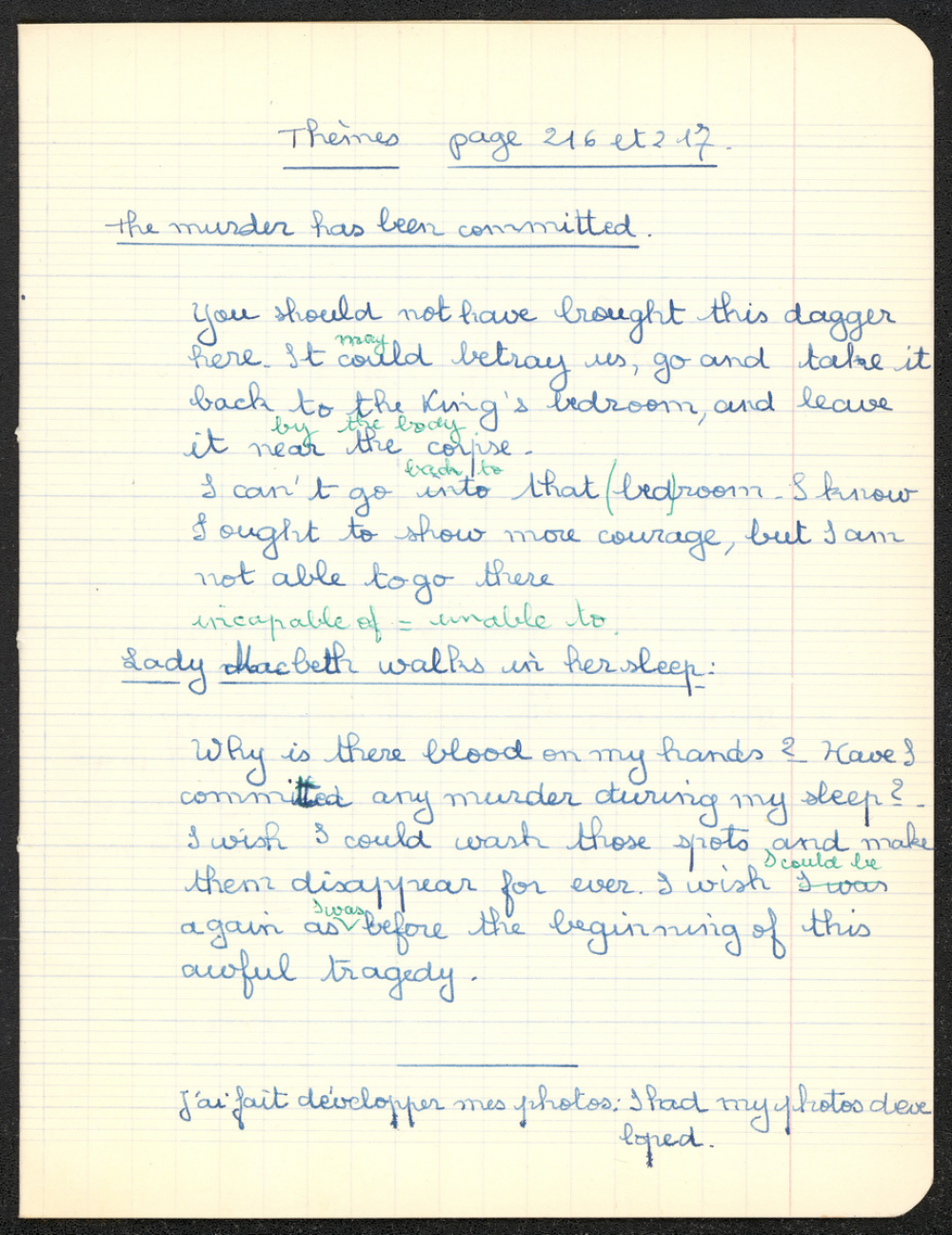 Notes : Cahier d'Anglais de Martine Leroy-Bouveyron (née Leroy) alors âgée de 16 ans, élève de 2nde M3, au Lycée Victor Duruy à Paris (VIIe arrondissement), durant l'année 1963-1964.