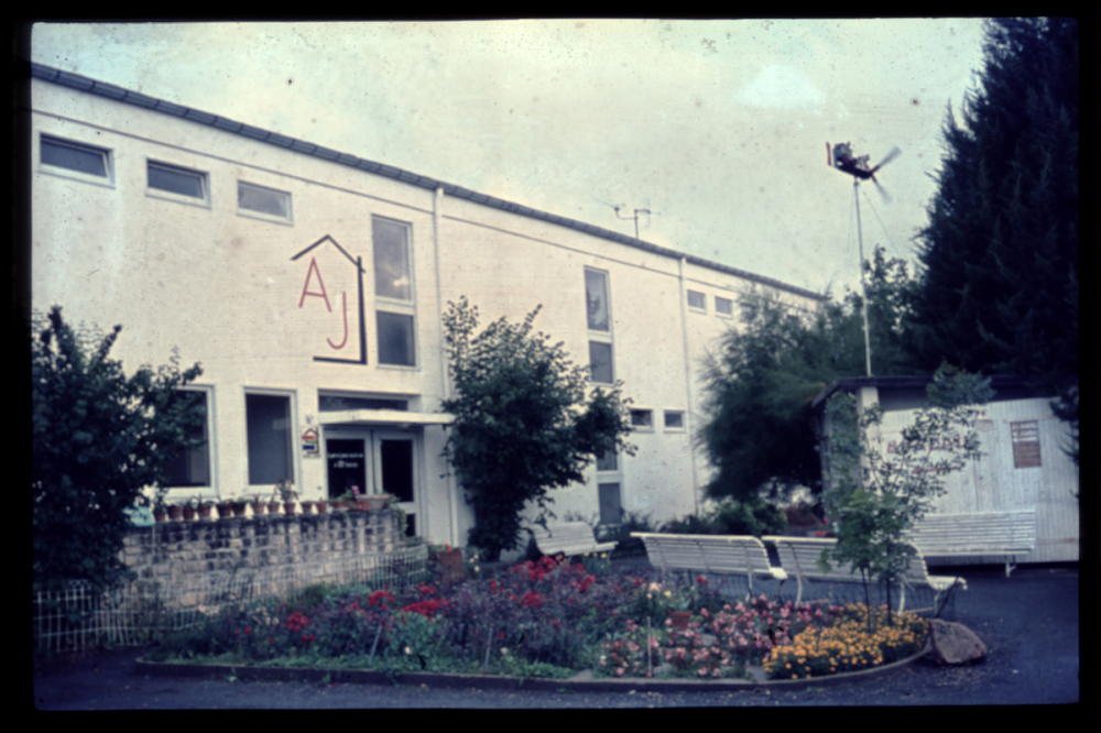 Représentations : vue d'architecture : auberge / La façade de l'auberge présente une peinture représentant une maison avec les lettres AJ en rouge à l'intérieur. Devant l'auberge se trouve un parterre de fleurs et des bancs. À côté de la porte, un panneau affiche le logo de la FUAJ.