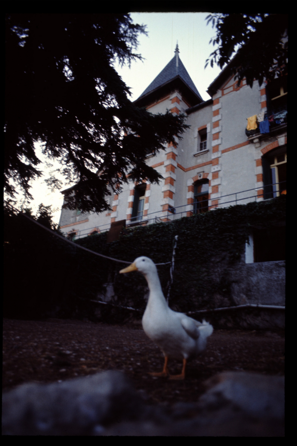 Représentations : vue d'architecture : auberge / Une partie de la façade de l'auberge est visible, avec un canard au premier plan dans la cour et un filet de volley-ball.