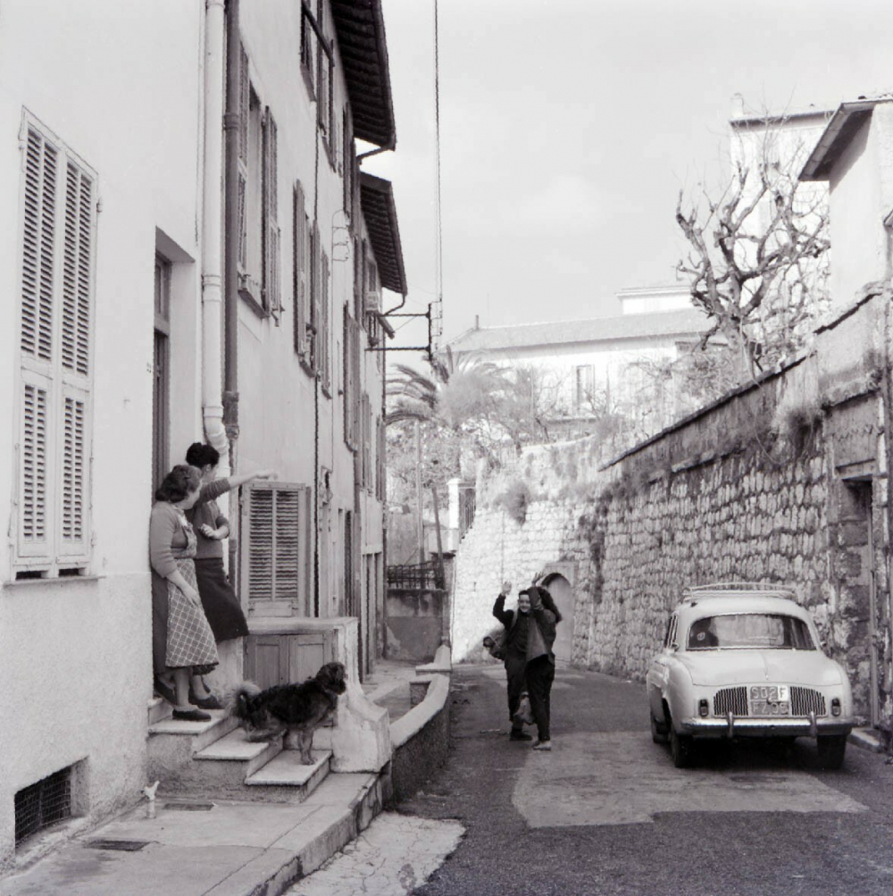 Représentations : scène : rue, jeunes gens, femme, chien, automobile / Dans une rue ancienne aux murs de pierre, deux jeunes gens saluent de la main des femmes sur les marches d'une maison qui leur font signe. Un chien est avec elles. Automobile garée.