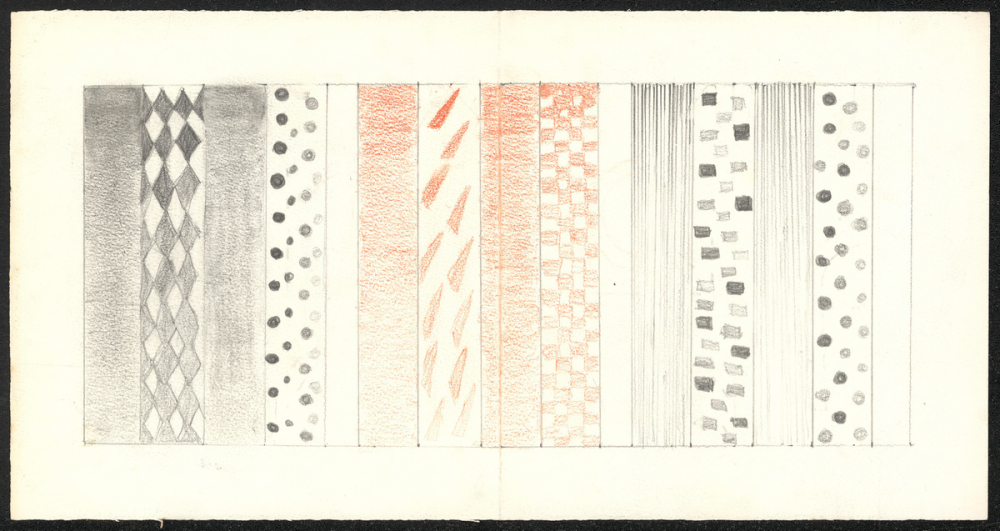 Représentations : figure géométrique / Représentation de bandeaux de différentes couleurs alternant des bandeaux pleins, des vides, et d'autres contenant des rayures, des losanges, des ronds, des carrés et des triangles. Ils sont faits ou au crayon à papier ou au crayon de couleur orange. Au verso, l'élève a écrit ses initiales "cf" en grosses lettres coloriées au crayon à papier.