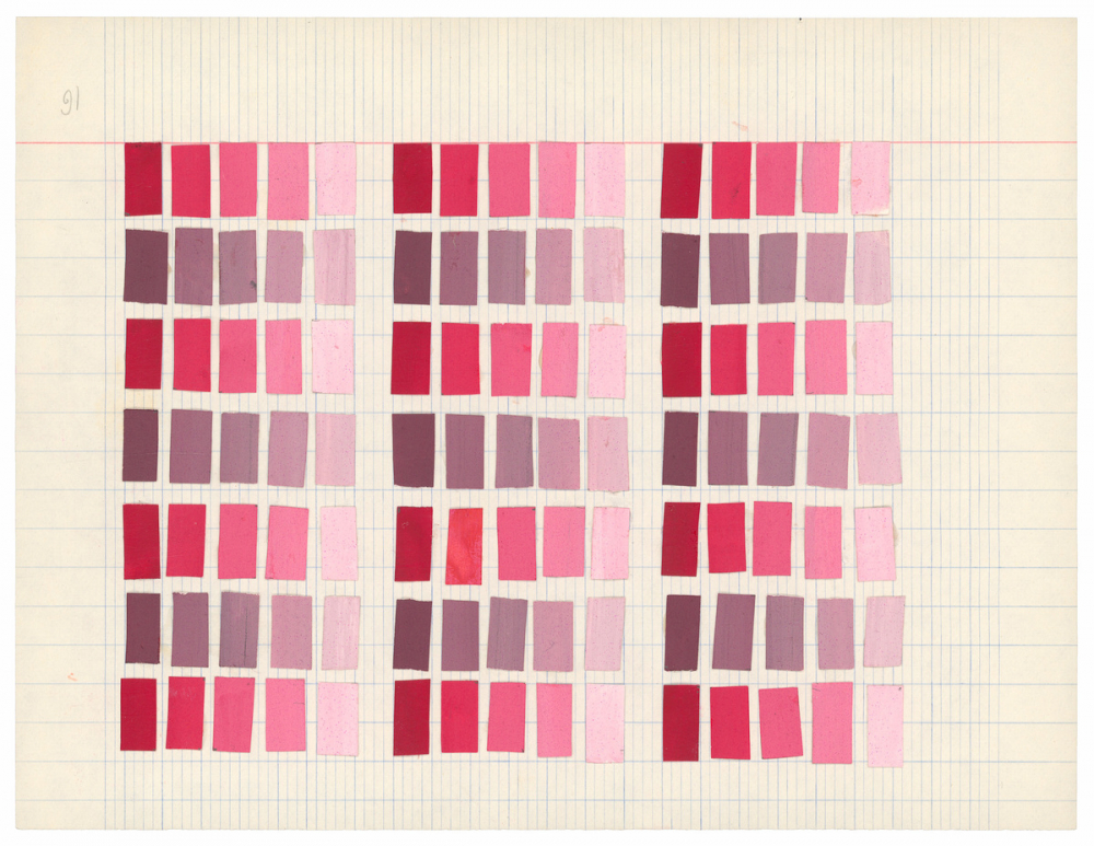 Représentations : jeu de papiers / 105 bandelettes de papier sont collées par 3 groupes de 35, en 7 lignes de 5. Elles sont de différentes nuances de rouge, rose, et violet.
