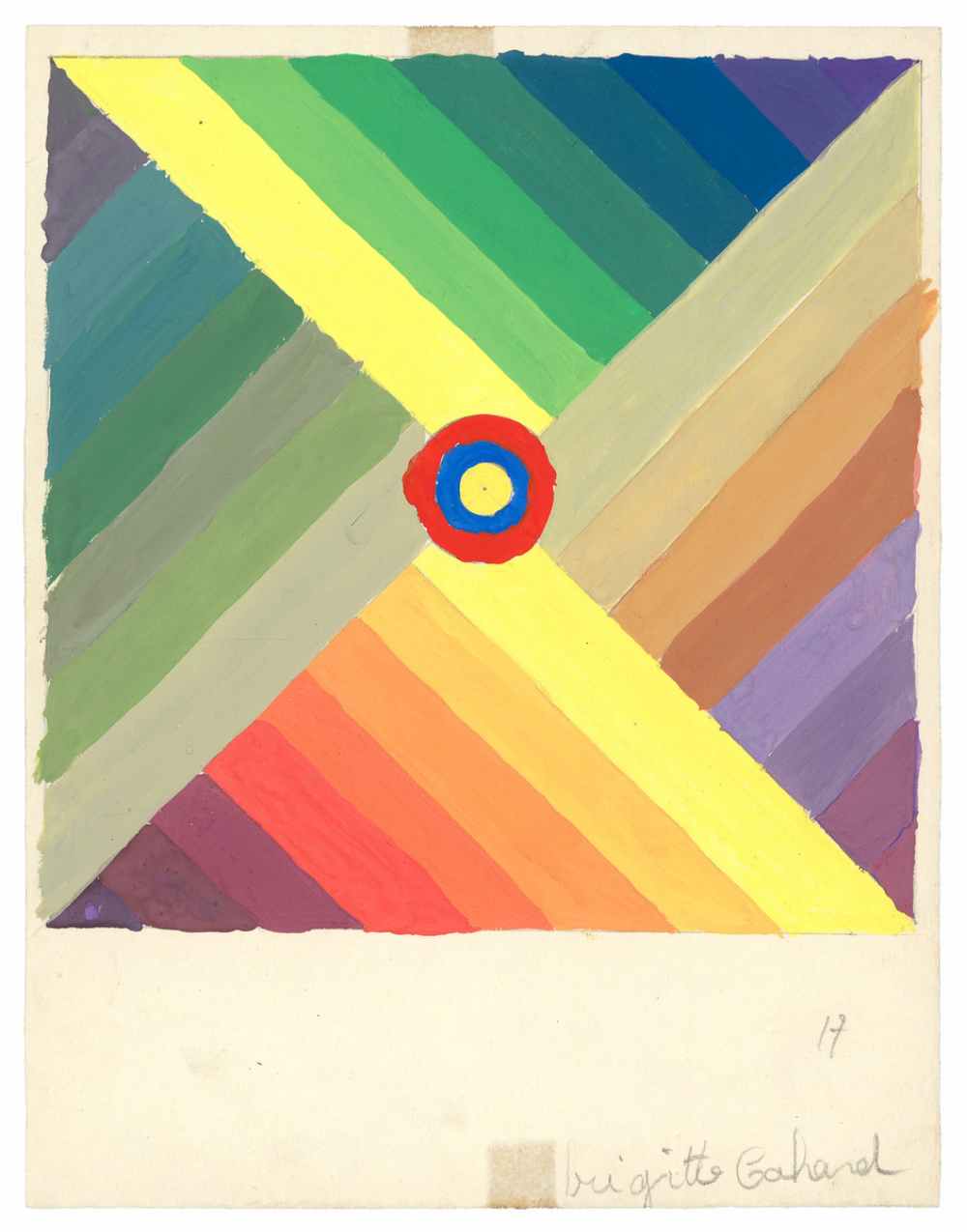 Représentations : couleur / Dans un carré coupé en quatre par deux diagonales sont dessinées 32 bandelettes réparties par 8 dans les quatre parties du carré. Elles sont peintes de différentes couleurs, rassemblées en familles de couleurs et ordonnées selon les différentes nuances. Au centre, un cercle bleu et un cercle rouge sont peints à la croisée des deux diagonales.