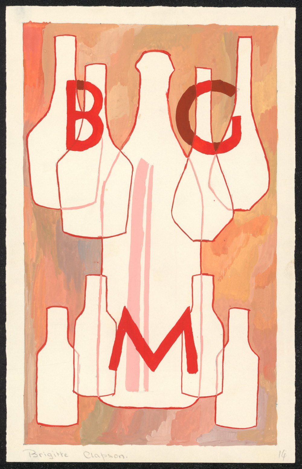 Représentations : bouteille / La feuille est peinte par des coups de pinceau de différentes nuances de rouge, orange, rose, et gris, dans un cadre tracé au crayon à papier et prenant quasiment toute la surface de la feuille. Neuf bouteilles (sans doute de vin ou de liqueur) sont représentées par des espaces laissés blancs au milieu du cadre et entourés par des traits de peinture rouge. Au centre de la feuille se trouve une grande bouteille, qui est chevauchée par d'autres plus petites. Là où les bouteilles se rencontrent les traits ne sont plus rouges mais roses. Deux grands traits verticaux de peinture rose traversent la grande bouteille. Les lettres B et G sont écrites en gros en haut, et la lettre M en bas au milieu. Lorsqu'elles sont sur la peinture, elles sont rouges bordeaux, mais lorsqu'elles recouvrent les bouteilles elles sont peintes en un rouge plus clair.