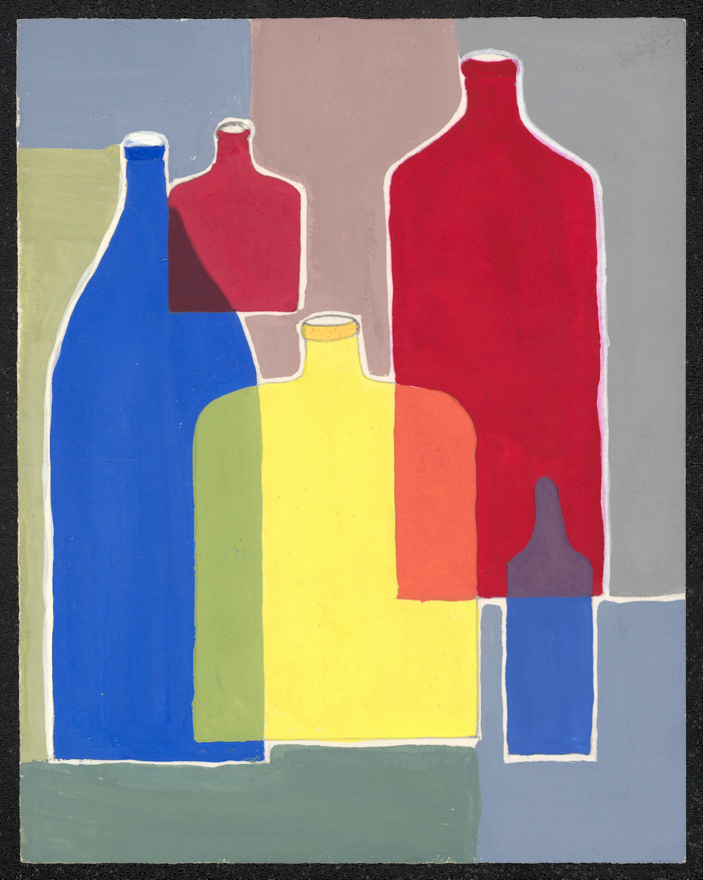 Représentations : bouteille / Sur un fond peint de six nuances de gris, vert, bleu, et mauve, sont représentées cinq bouteilles de tailles différentes. Deux d'entre elles sont bleues, deux sont rouges, et une est jaune. Elles se chevauchent les unes les autres, et leurs jonctions sont peintes du mélange des deux couleurs. Un mince espace blanc entoure les bouteilles pour les séparer du fond de couleur.