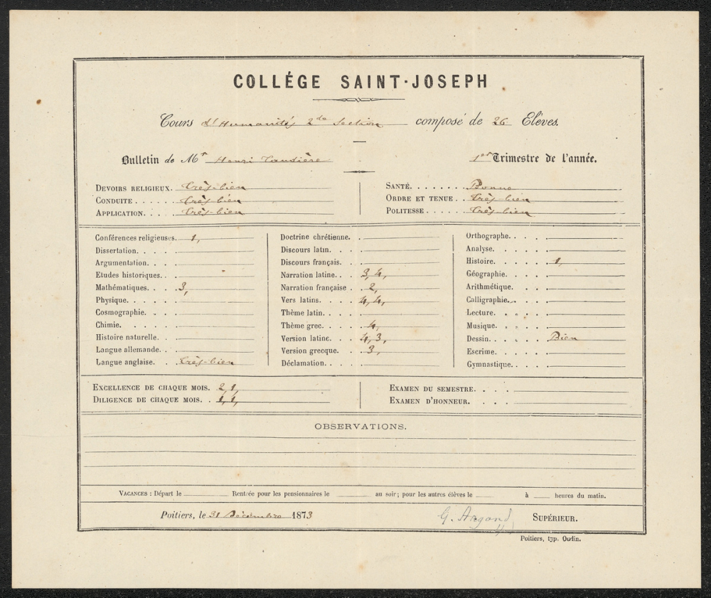 Notes : Il s'agit du bulletin scolaire du premier trimestre de l'élève Henry Taudière, scolarisé au collège Saint-Joseph de Poitiers, probablement en classe de seconde (Humanités 2e section) durant l'année 1873 à 1874.