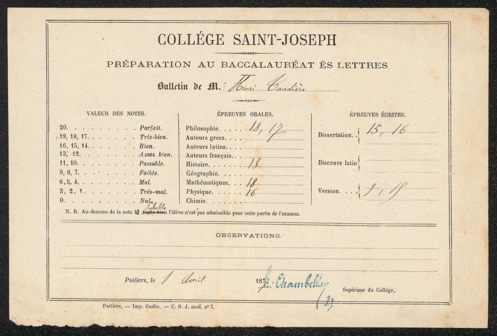 Notes : Il s'agit du bulletin de préparation au Baccalauréat ès Lettres de l'élève Henry Taudière, scolarisé au collège Saint-Joseph de Poitiers, en classe de terminale (Philosophie) durant l'année 1876 à 1877.