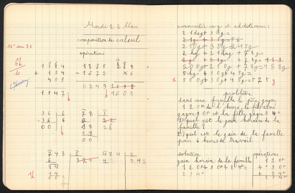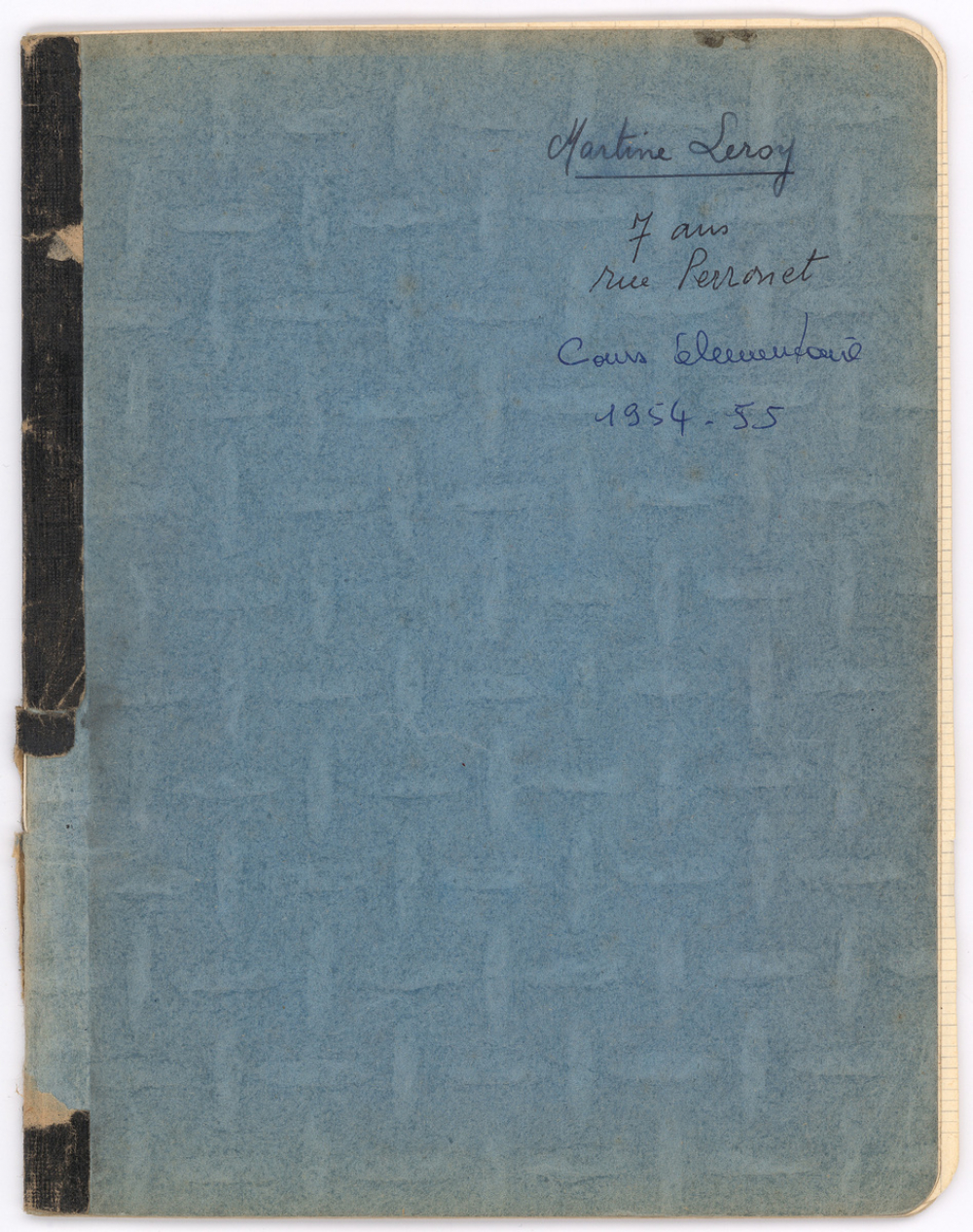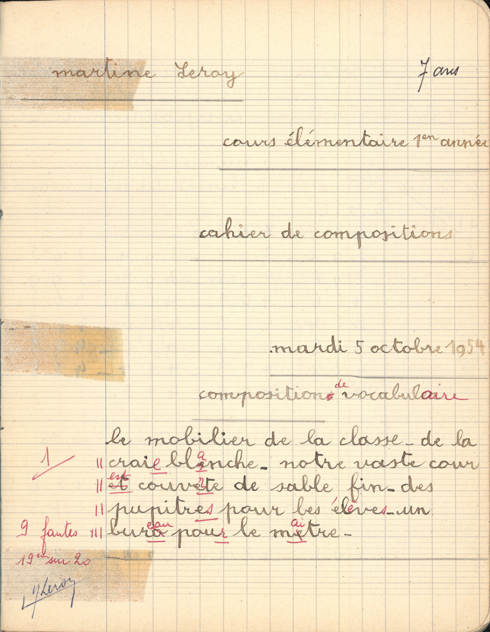 Notes : Cahier de compostions de Martine Leroy-Bouveyron (née Leroy) alors âgée de 7 ans, élève de cours élémentaire 1ère année ou classe de 10e à l'Ecole paroissiale des Filles à Paris (VIIe arrondissement), durant l'année 1954-1955.La première mention de datation remonte au mardi 05 octobre 1954 et la dernière au mercredi 08 juin 1955.