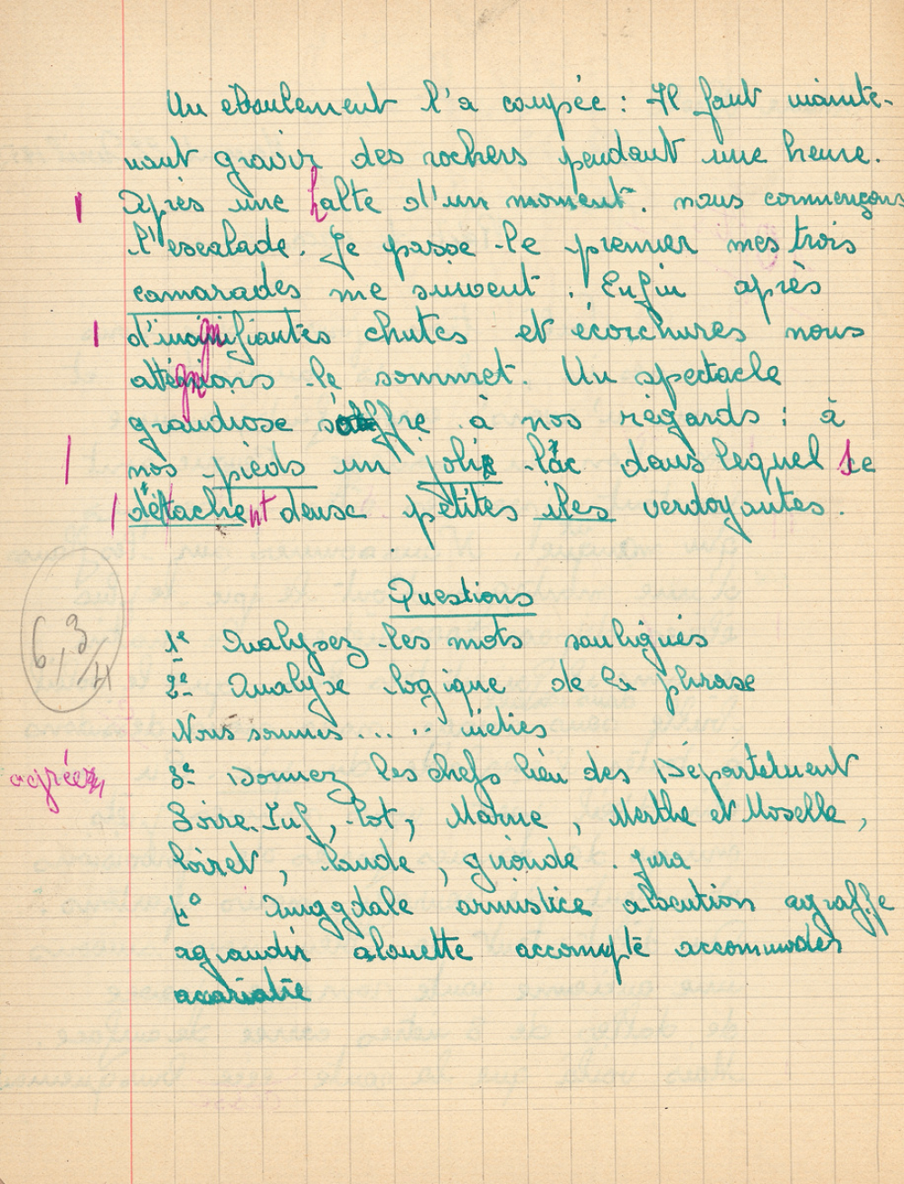 Notes : Cahier d'exercices d'une élève de 5e (selon les autres cahiers de la même élève): dictées, analyse logique d'une phrase, analyse de mots, vocabulaire (ordre alphabétique), conjugaison (présent, passé simple, imparfait), les exercices sont notés. La 2e partie du cahier semble avoir servi de brouillon pour des comptes; dessin sur la dernière page.