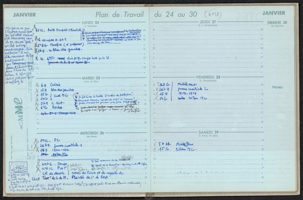 Dans son agenda l'auteur recense, les classes dont il a la charge (parfois, les noms des élèves, les professeurs intervenants), le titre des séances enseignées, les lots de copies à corriger, les dates des examens et des vacances.