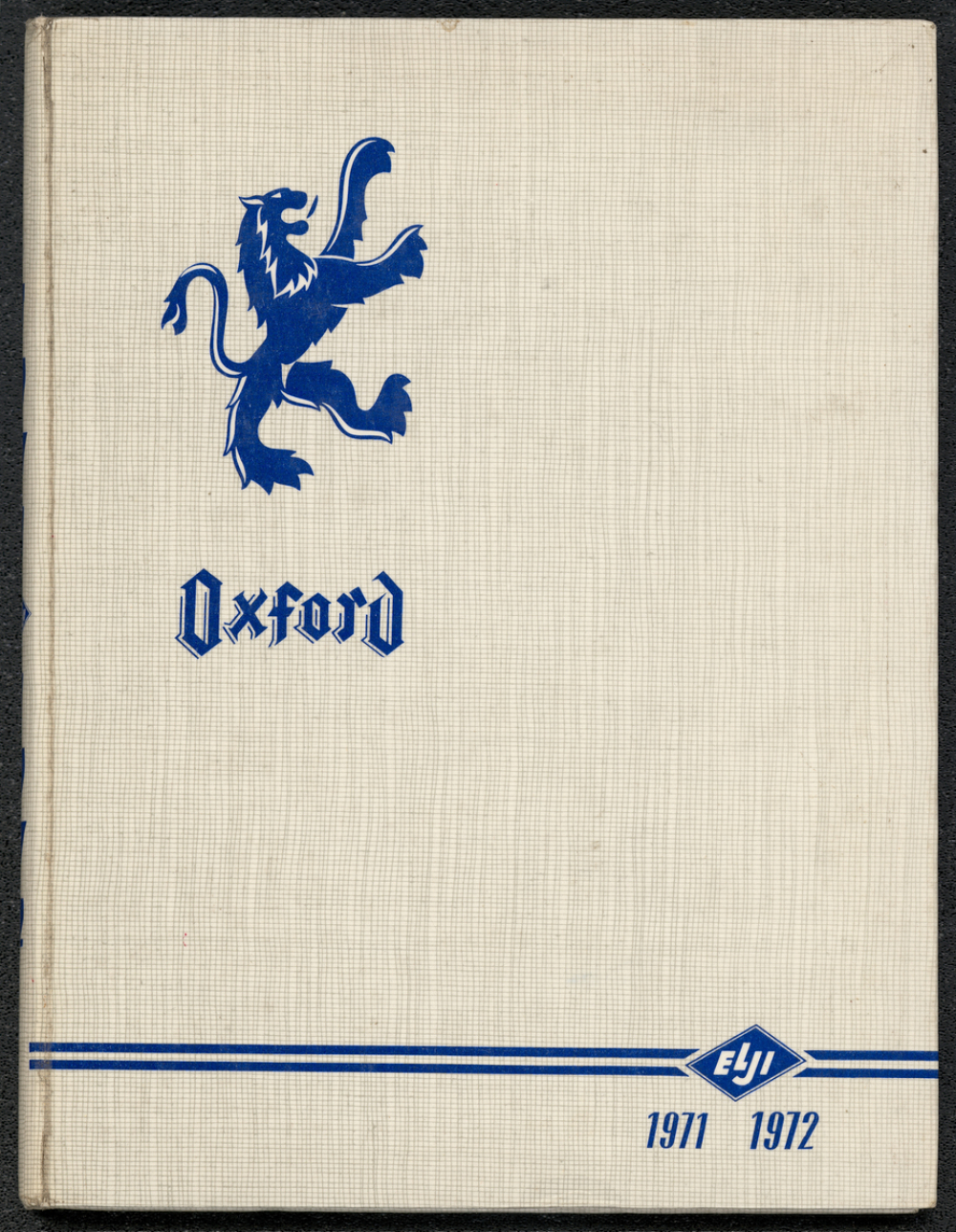 Éditeur : Oxford, Elji 1970-1971. Insigne de la marque représentant un lion bleu rampant de profil, levé sur la patte arrière droite avec les pattes avant droite et gauche avancées en position d'attaque, la queue relevée verticalement dont l'extrémité forme une vague.