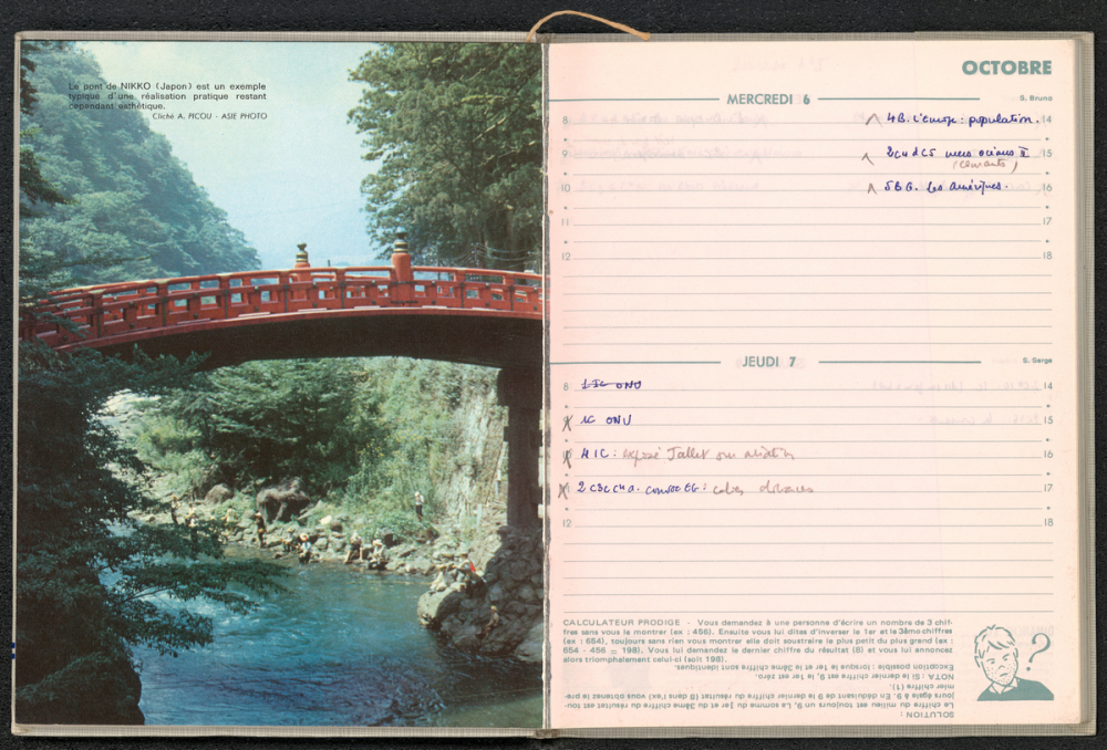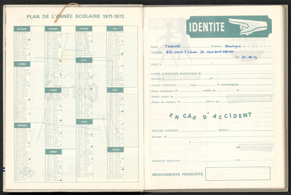 Notes : Il s'agit de l'agenda scolaire de Dominique Thomas, enseignant d'Histoire-Géographie et d'Instruction Civique au lycée Fontenelle (futur collège), ainsi qu'au lycée Jeanne d'Arc de Rouen, durant l'année 1970-1971.