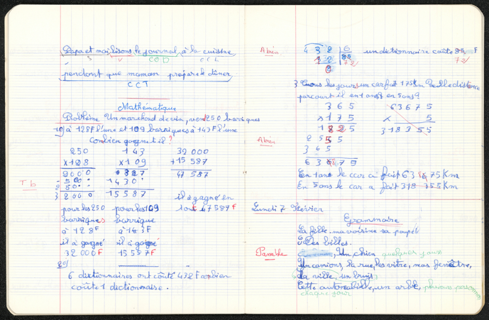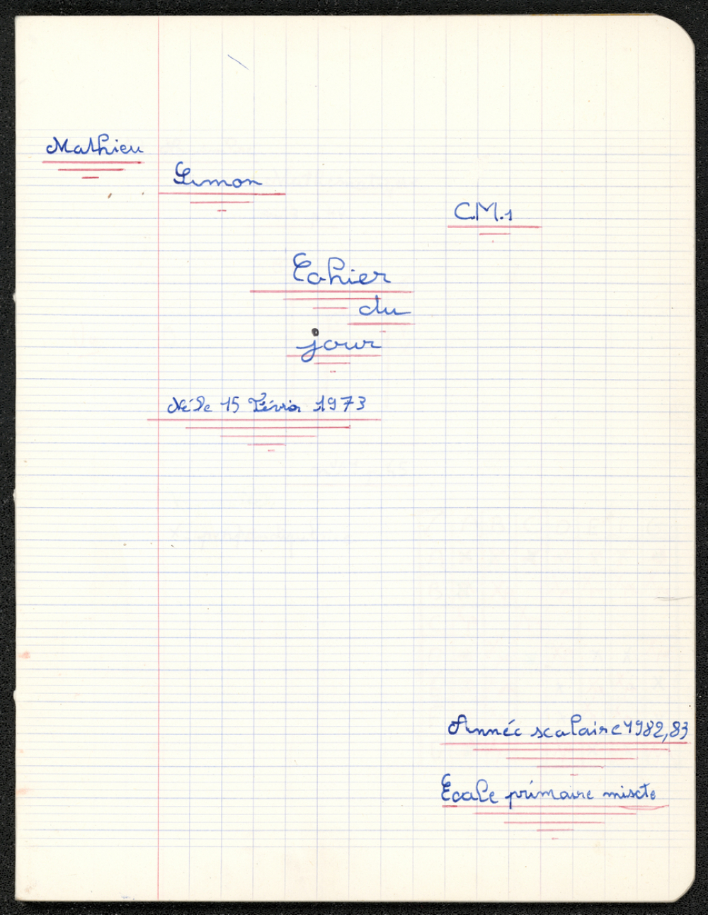 Notes : Cahier de devoirs journaliers appartenant à Simon Mathieu, scolarisé en classe de CM1 pour l'année scolaire 1982-1983.