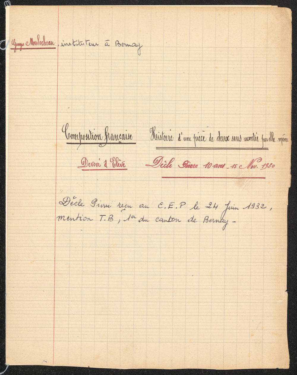 Notes : Il s'agit d'une copie de composition française de Pierre Dècle, du 15 novembre 1930, reliée ultérieurement par son instituteur Georges Mulocheau. L'auteur a alors 10 ans et est scolarisé à Bernay.