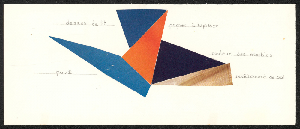 Représentations : figure géométrique, décoration / 4 triangles et un quadrilatère sont collés sur la feuille, les uns à côté des autres en se touchant à leurs bords. Ils sont bleus, orange, noir, ou couleur bois. L'assemblage ne semble rien représenter de particulier. Autour des figures sont écrits au crayon à papier les termes "pouf", "dessus de lit", "papier à tapisser", "couleur des meubles", "revêtement de sol", reliés par des traits aux différentes figures.