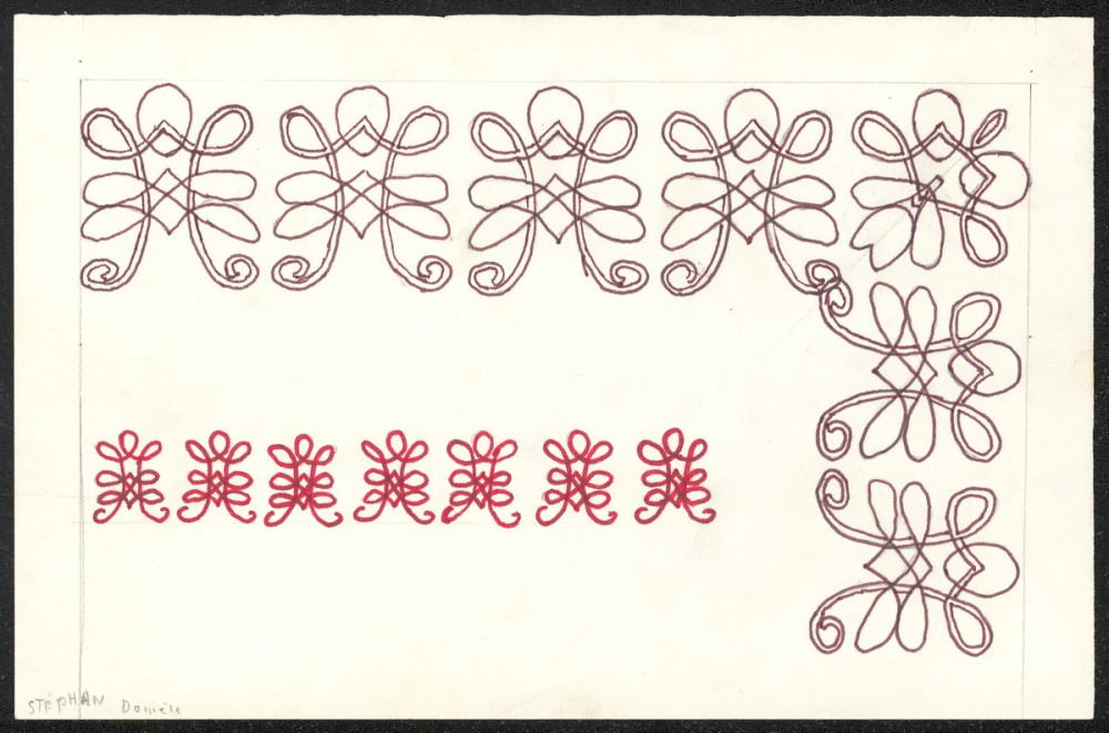 Historique : Ce dessin appartient à une série de travaux d'élèves conservés à l'origine par la professeure d'éducation artistique de l'École technique puis Lycée technique Jeanne d'Arc, à Sainte-Adresse (76), réalisés entre 1958 et 1985. Il faisait partie d'un lot intitulé : du trait au décor.