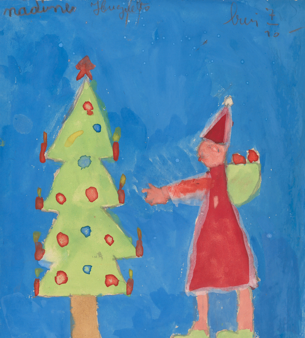 Description : Peinture sur papier bistre représentant un Père Noël à côté d'un sapin décoré, sur fond bleu, gouache, en haut, nom et prénom de l'élève, "bien 7/10" manuscrits au crayon de bois.