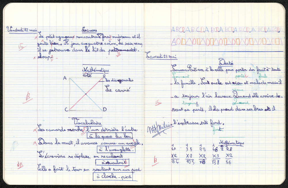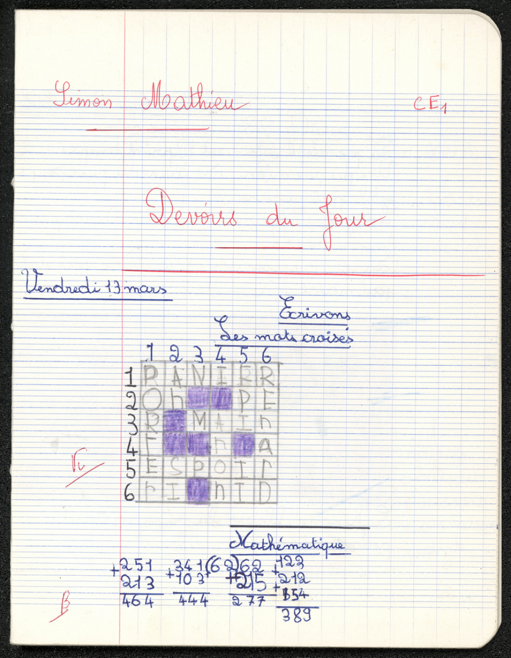 Notes : Cahier de devoirs journaliers appartenant à Simon Mathieu, scolarisé en classe de CE1 pour l'année scolaire 1980-1981.