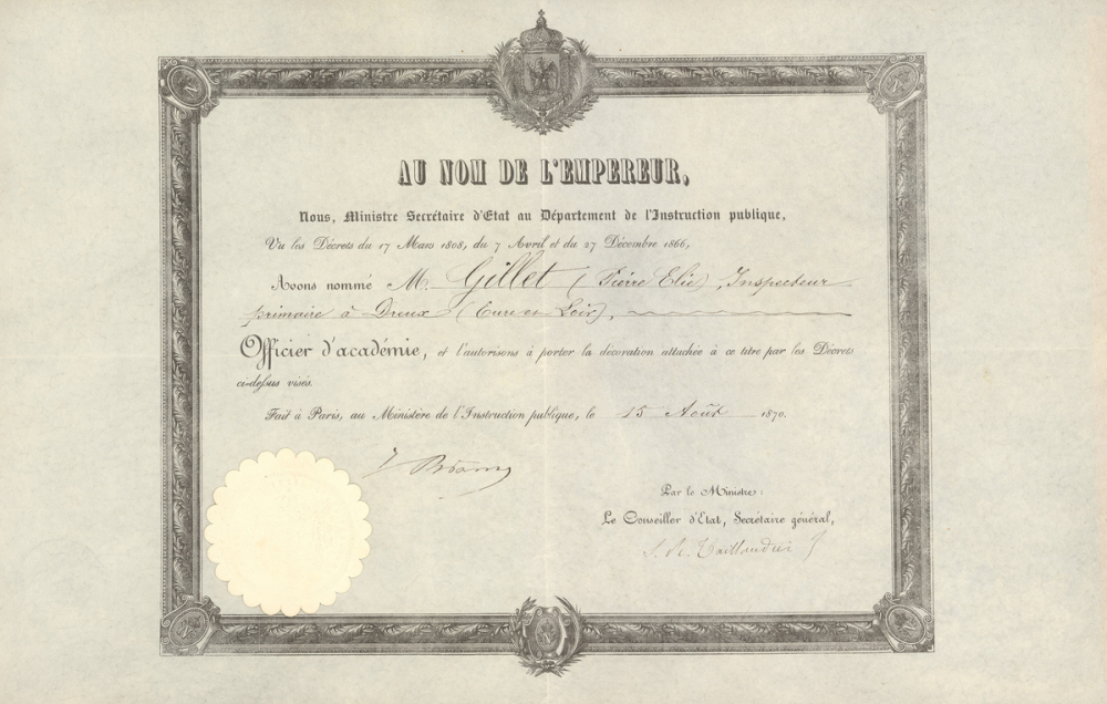 Notes : Diplôme décerné par le Ministre de l'Instruction Publique le 15 août 1870 à "M. Gillet (Pierre Elie), Inspecteur primaire à Dreux (Eure et Loir)".