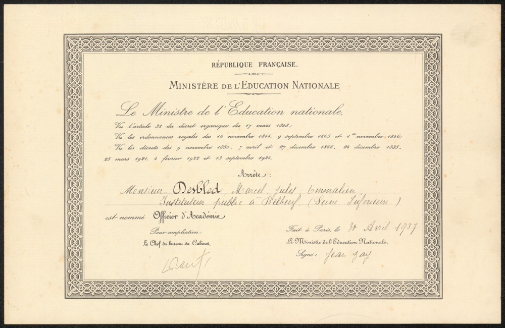 Utilisation / destination : récompense (Diplôme, daté du 30 avril 1937, arrêtant la nomination d'Officier d'Académie pour Monsieur Desbled Marcel Jules, Emmalien, instituteur public à Belbeuf.)